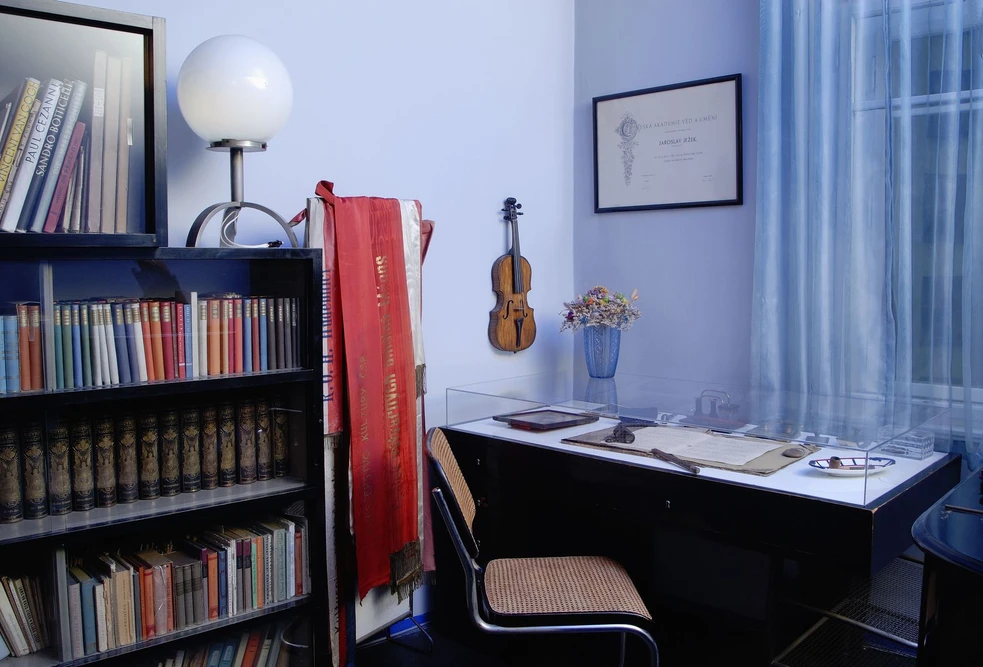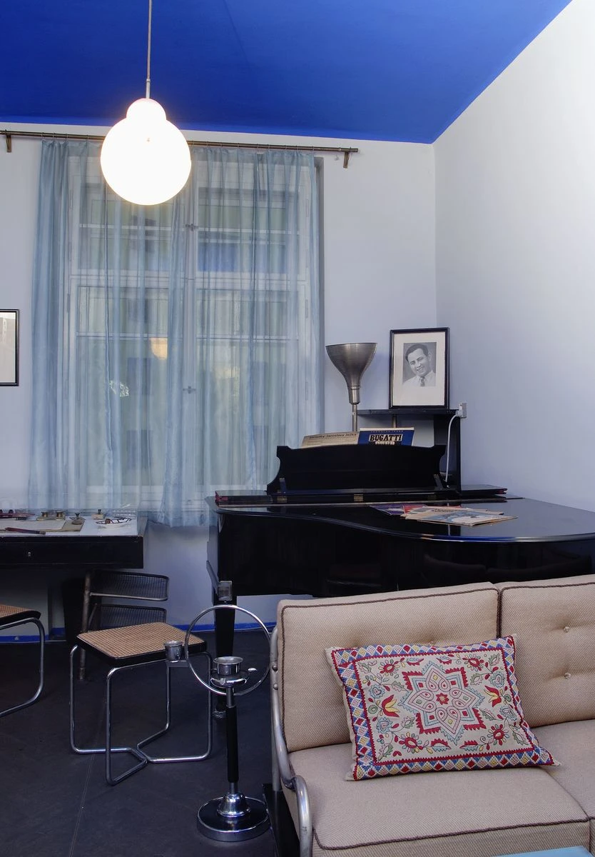 Pokoj, ve kterém se Památník Jaroslava Ježka nachází, je součástí soukromého bytu v původním stavu z počátku 30. let 20. století. Sytě modrý strop, který měl slabozrakému Ježkovi pomáhat orientaci v prostoru, dal pokoji i jméno. Zařízení interiéru ve stylu funkcionalismu na přání skladatele navrhl jeho přítel, architekt František Zelenka, který byl též autorem scénických návrhů pro Osvobozené divadlo. K vidění je zde mimo jiné také originální Ježkův klavír, knihovna a diskotéka. Více
