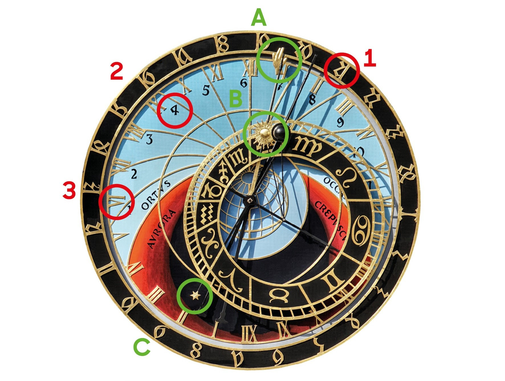 Kruhová deska astronomických hodin zvaná astroláb tvoří základ každého orloje. Jeho původ sahá až do doby starověku — používal se k určování polohy hvězd, Slunce a Měsíce. Byl důležitý pro astrology a mořeplavce, sloužil také k určování místního času, případně k navigaci. Staroměstský orloj je konstruován velmi důmyslně a ve své době patřil k nejlepším na světě. Horní modrá plocha astrolábu představuje denní nebe, pod ní je zlatý oblouk obzoru, červený pás značí ranní a večerní červánky a černý kruh je noc. Po modrém nebi se zleva doprava pohybují Slunce, Měsíc a hvězdy. Pohyb nebeských těles Velký kruh se skládá ze dvou kruhových částí spojených uprostřed čepem. Nastavením vzájemných poloh těchto kruhových částí je možno zobrazit polohu hvězd na obloze. Deska astrolábu představuje pohled na nebe jižním směrem. Uprostřed astrolábu je znázorněna Země. Dále jsou na desce tři zlaté soustředné kruhy: obratník Kozoroha, rovník a obratník Raka. Obratník Raka je nejvzdálenější soustředný kruh na astrolábu, což odpovídá skutečnosti, že je to nejsevernější rovnoběžka na severní polokouli, kde je Slunce v zenitu při letním slunovratu. Obratník Kozoroha je na astrolábu znázorněn nejmenší soustřednou kružnicí. Je to nejjižnější rovnoběžka na jižní polokouli, kde je Slunce v zenitu a to při zimním slunovratu. Prstenec zvěrokruhu (nebo také Zvířetníku či Zodiaku) je umístěný na ručičce hvězdného času, která se pohybuje o něco rychleji než ručička času slunečního. Pohybem se posouvá symbol Slunce po jeho ručce způsobem, který uvádí do pohybu zvěrokruh, díky čemuž ukazuje na aktuální astrologické znamení. K ikonickému zlatému žebříčku okolo přišel zvěrokruh při rekonstrukci v letech 1864—1865, kdy byl nahrazen zvěrokruhem novým, omylem však o menším průměru. Obvod zodiaku byl pak dorovnán kruhem z páskové oceli, který byl později ještě doplněn o příčky rozdělující obvod zvěrokruhu po 5 stupních. Slunce (sluneční ruka) je nejdůležitější součástí orloje. Astroláb je nastaven podle místního slunečního času, tzn. v pravé poledne musí být Slunce nejvýše nad obzorem. Slunce je umístěno na stejné rafii jako zlatá ruka ukazující čas. Rafie se Sluncem obejde astroláb jedenkrát za 24 hodin. Zlatá ruka ukazuje na stupnici čtyřiadvacetníku (s gotickými číslicemi) čas staročeský, na římských číslicích ukazuje čas středoevropský (nebo také staroněmecký), kdy den začíná a končí o půlnoci tak, jak je obvyklé i v současné době. Pokud je zlatá ruka zakrytá jinou částí astrolábu, čas je možné odečítat v prodloužení na druhé straně ciferníku, kde je shodné číslování. Měsíc (měsíční ruka) se pohybuje po ekliptice na stejném mechanickém principu jako Slunce. Měsíc představuje dutá koule se šroubovicí a závažím uvnitř. Jak ručička s Měsícem obíhá číselník, závaží nutí kouli, aby se otáčela kolem své osy. Jedna půlka jejího povrchu je stříbrná, druhá černá. Měsíc tak dorůstá do úplňku a zase couvá, stejně jako na obloze. Otočí se za dvacet devět a půl dne, tedy od úplňku k úplňku. Čtyři druhy času Gotické cifry po obvodu ciferníku (1) slouží k odečtu času staročeského, který je ukazován zlatou ručičkou (A). Arabské číslice na modrém poli (2) představují čas babylonský, jejž svou polohou určuje průsečík rafije Slunce (B) a vnějšího obvodu zvěrokruhu. Pomocí římských cifer (3) pak odečítáme hodiny poloorlojní a hvězdné — zatímco poloorlojní čas ukazuje zlatá ručička (A), ukazatelem hvězdného času je zlatá hvězda (C). Čas staročeský Staročeskému času, kdy začínal nový den západem Slunce, rozuměli naši předkové. Říkávalo se mu také italský. Vyznačují ho zlaté gotické číslice v černém okruží na vnějším, zvlášť ovládaném prstenci hodin. Polohu tohoto času ukazuje také zlatá ruka. Čas babylonský Nebo také nestejný, planetní, temporální či arabský čas byl počítaný jen od východu do západu Slunce, což znamená, že čas nemohl být stejný, neboť v létě jsou hodiny delší než v zimě. Čas je zobrazen jednoduchými 12 černými arabskými číslicemi v modrém poli. Staroměstský orloj je na světě jediný, který tento čas zvládne měřit. Čas středoevropský nebo také staroněmecký či poloorlojní Je označen zlacenými římskými číslicemi na obvodu sféry. Ukazuje ho sluneční ručička, která je výrazným ukazatelem orloje. Je nám dnes zcela srozumitelný, ale hodiny jej odbíjejí teprve od poválečné rekonstrukce, dokončené v roce 1948. Hvězdný čas V roce 1865 přibyl na orloji ukazatel času hvězdného či siderického. Od slunečního dne, který trvá 24 hodin, je hvězdný den asi o 4 minuty kratší. Na římských číslicích jej ukazuje rafie s hvězdičkou upevněnou na zodiaku — nejdříve prvních 12 hodin dvanácti zlacenými ciframi na pravé straně astrolábu, ale k dalším číslicícm I—XII na straně levé je nutné vždy přičíst hodnotu 12, tj. počet hodin první poloviny hvězdného dne. Kalendárium Pod astrolábem je umístěna další kruhová deska o průměru téměř 270 cm. Jedná se o kalendárium, které je v dnešní podobě součástí pražského orloje od roku 1866. Nese jména světců pro každý den v roce, uvádí pořadové číslo dnů v měsíci i nedělní písmeno, po jeho obvodu jsou pak vypsány slabiky cisiojanu – rýmované říkanky od K. J. Erbena coby pomůcky k zapamatování si významných dnů v roce. Na desce jsou znázorněny výjevy z venkovského života typické pro jednotlivé měsíce v roce, figurální motivy pak vyobrazují znamení Zvěrokruhu. Uprostřed des