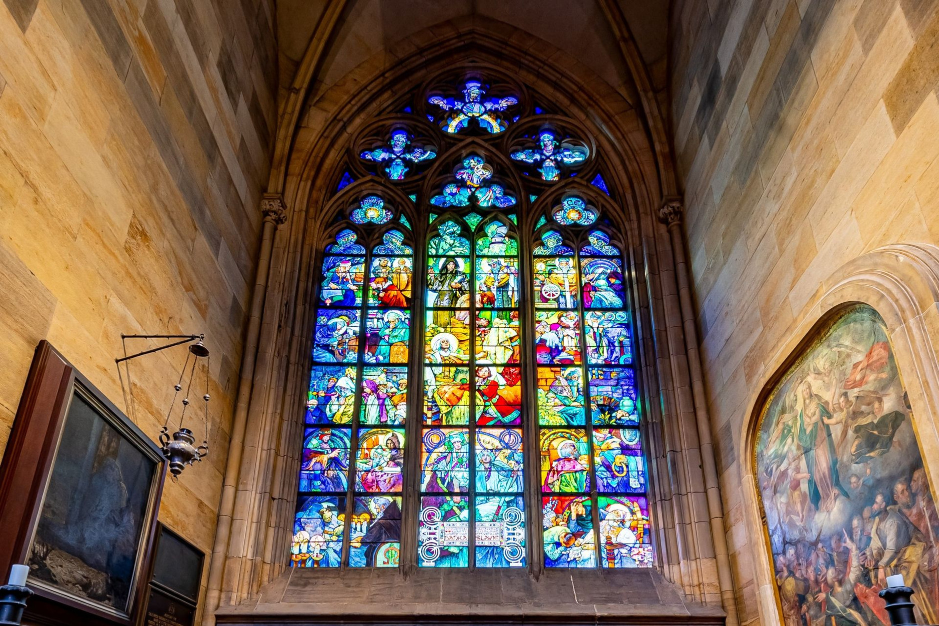 Pěší trasa: areál Strahovského kláštera: bazilika Nanebevzetí Panny Marie, strahovská fara — katedrála sv. Víta, Václava a Vojtěcha — Thunovský palác — Svatomikulášská městská zvonice Areál Strahovského kláštera Vycházka, po které se dnes vydáte po stopách Alfonse Muchy, začíná nedaleko stanice Pohořelec (tram 22) v areálu Strahovského kláštera. Toto starodávné místo s nepopsatelným geniem loci zasáhlo Muchovi do života hned několikrát. Bazilika Nanebevzetí Panny Marie, v jádru trojlodní románská stavba, získala dnešní podobu barokní úpravou. Pro Alfonse Muchu se stala jednou z prvních velkých inspirací, a to výzdobou svojí hlavní lodi od J. W. Neunherzte; cyklem fresek s mariánskými motivy na klenbě a na stěnách freskami s výjevy ze života svatého Norberta. Marie Muchová vzpomíná: „Strahov mu zůstal drahou vzpomínkou a již v Paříži vyprávěl mi o chvílích svého zanícení, kdy sedával na kůru pohřížen v krásu hudby, zatím co jeho oči vnímaly tu krásu malovaných kleneb a mysl jeho toužila také vytvořit takové krásné obrazy ku slávě Boží.“ (zdroj: Mucha Foundation). Roku 1906 se v tomto kostele pak konala i Muchova svatba se slečnou Marií Chytilovou, jeho drahou ženou. Bazilika Nanebevzetí Panny Marie na Strahově | Foto © A. Červená Schodištěm poté sejděte na Pohořelec, kde je strahovská fara, druhá stavba, která se zde s Muchou pojí. Tady malíř strávil několik nocí u rodiny strahovského varhaníka Vollbergera, otce Muchova učitele hudby v Ivančicích. Stalo se tak roku 1878, když si mladý Mucha jel do Prahy pro odpověď, zda byl přijat na Akademii výtvarných umění. Tehdy byl však rázně odmítnut s doporučením, aby si hledal jiného zaměstnání. Loretánskou ulicí se vydejte až k Hradčanskému náměstí, odkud vstoupíte do areálu Pražského hradu a přes II. nádvoří dojdete až ke katedrále sv. Víta, Václava a Vojtěcha. Katedrála sv. Víta, Václava a Vojtěcha Historie tohoto chrámu sahá do první třetiny 10. století, kdy kníže Václav získal od východofranckého císaře Jindřicha Ptáčníka relikvii ramene svatého Víta. Václav nechal zbudovat rotundu svatého Víta, kníže Spytihněv II. na místě rotundy vztyčil románskou baziliku a na jejím místě roku 1344 Karel IV. se svým otcem Janem založili katedrální chrám. Sloužil jako kapitulní kostel pro pražského arcibiskupa i jako korunovační, byl pohřebištěm králů a klenotnicí nejvzácnějších pokladů. Katedrála však nebyla několik století dostavěna, a proto se dnes skládá ze dvou částí: východní část s chórem s kaplemi a velkou zvonovou věží pochází z 14.—15. století; západní část s příčnou lodí, trojlodím a průčelím s věžemi byla přistavěna teprve v 2. polovině 19. století a na počátku století dvacátého. A právě při dostavbě katedrály byl Alfons Mucha českou bankou Slavie požádán o výzdobu jednoho okna. Vitrážové okno bylo nakonec do severní lodi chrámu vsazeno roku 1931. Ústřední panel představuje svatého Václava s babičkou svatou Ludmilou a výjevy ze života slovanských věrozvěstů sv. Cyrila a Metoděje. V blízkosti Krista je zakomponován obraz bohyně Slavie jako emblém banky. Okno v katedrále sv. Víta podle Muchova návrhu | Zdroj © Metropolitní kapitula, foto Radoslav Vnenčák Okouzleni místem a barevností Muchovy vitráže se můžete vrátit na I. nádvoří Hradu a pokochat se vyhlídkou na město. Pomalu sejděte po Nových zámeckých schodech. Na jejich úpatí na vás čeká další místo úzce spojené se životem slavného malíře. Thunovská 25 Renesanční Palác pánů z Hradce (nazývaný také Slavatovský, Kolovratský nebo Thunovský), vzniklý postupně úpravami tří vyhořelých domů v 2. polovině 16. století a poté barokně přestavěný, se obrací svým bývalým hlavním průčelím směrem k Zámeckým schodům a ovládá spodní část jejich pravé strany. Na fasádě paláce je umístěna bronzová pamětní deska s reliéfní podobiznou připomínající, že zde Alfons Mucha s rodinou mezi lety 1911—1924 bydlel. „Mezitím se babičce podařilo najít velký byt pro nás pro všechny. Byl na Malé Straně v Thunovské ulici č. 25, v druhém patře historického Thunovského paláce. …. Byt měl pět pokojů v jedné řadě. Všechna okna obrácená na jih s překrásnou vyhlídkou na celou Prahu, na Petřín a na kouzelné malostranské střechy.“ (zdroj: Mucha Foundation, cit. Jaroslava Muchová). Svatomikulášská městská zvonice Posledním zastavením na vycházce Hradčany a Malou Stranou za Alfonsem Muchou je Svatomikulášská městská zvonice. Věž, zvonici či hlásku přiléhající ke kostelu sv. Mikuláše dokončil roku 1755 Anselmo Lurago. Věž patřila vždy obci, nikoliv církvi, a proto nad portálem najdeme i číslo popisné, které se kostelům zpravidla nepřiděluje. Poslední hlásný, mající za úkol zvonit při požáru a ukazovat fáborem (a v noci lucernou) z ochozu směr, z něhož se oheň šíří, se odstěhoval až roku 1891. Následně zde bydlel malíř Jan Vochoč, velmi blízký přítel Alfonse Muchy. Sdíleli spolu dokonce nějaký čas v Paříži ateliér, a když se Vochoč ve Francii ženil s Magdalenou Kozákovou, šel mu Mucha za svědka. Před koncem vycházky se můžete vydat na prohlídku věže, z níž je neopakovatelný pohled na Malou Stranu. Chrám sv. Mikuláše se Svatomikulášskou městskou zvonicí | Zdroj: Prague City Tourism Mapa trasy 1. Strahovský klášter 2. Strahovská fara (Pohořelec č. p. 23) 3. katedrála sv. Víta, Václava a Vojtěcha 4. palác Pánů z Hradce (Thunovská č. 25) 5. Svatomikulášská městská zvonice trasa