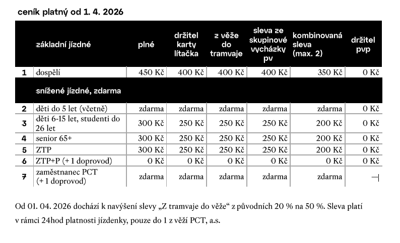 základní 400 Kč snížené 300 Kč (děti 6—15 let, studenti do 26 let, senioři od 65 let, osoby s průkazkou ZTP) držitelé průkazu ZTP/P + 1x doprovod — zdarma. Platnost jízdenky je 24 hodin. Nastoupit nebo vystoupit můžete po celé trase, kolikrát chcete. slevy Z věže rovnou do tramvaje Sleva 50 Kč na jízdenku po předložení vstupenky jednoho z objektů ve správě Prague City Tourism Sleva platí pouze v den platnosti vstupenky pouze při zakoupení přímo v Historické tramvaji 42 a při platbě platební kartou. Sleva se nevztahuje na skupinové školní vstupenky, vstupenky z přednáškových programů PCT a speciálních akcí. Sleva pro držitele karty Lítačka Sleva 50 Kč Slevu je možné uplatnit přímo v Historické tramvaji 42 u informačního pracovníka po předložení karty. Platba je možná jen bezkontaktní platební kartou. Akceptována bude Lítačka nahraná na fyzické kartě, v aplikaci či na platební kartě. Sleva pro účastníky pravidelných i individuálních vycházek pořádaných našimi oficiálními průvodci Sleva 50 Kč Slevu je možné uplatnit po předložení voucheru z vycházky do 7 dnů od data konání. Sleva se vztahuje na plné i zlevněné jízdné. Slevy je možné kombinovat — maximální možná sleva je 100 Kč při kombinaci dvou slev. naše tipy zvýhodněné vstupné na jednu z věží ve správě Prague City Tourism 20% sleva na vstup po dobu platnosti jízdenky (nevztahuje se na kombinované MULTI vstupné pro 9 objektů) Pro získání slevy stačí jízdenku v době její platnosti předložit při nákupu vstupenky na pokladně věže. sleva 50 Kč na jednu z pravidelných vycházek pořádaných našimi oficiálními průvodci Slevu získáte po předložení jízdenky pracovníkovi v kontaktním centru Guides&Tours na Staroměstské radnici. Slevu je možné uplatnit do 7 dnů od data platnosti jízdenky. zdarma s kartou Prague Visitor Pass Po předložení karty PVP v Historické tramvají 42 obdrží cestující celodenní jízdenku. kde koupit jízdenku ve voze u průvodčího platba v hotovosti, nebo platební kartou v turistických informačních centrech Prague City Tourism a. s.: Turistické informační centrum — Staroměstská radnice Staré Město Turistické informační centrum — Petřínská rozhledna Malá Strana Turistické informační centrum — Na Můstku Staré Město Turistické informační centrum — Pražský hrad Hradčany infocentra Dopravního podniku hl. m. Prahy Letiště Nádraží Veleslavín Hradčanská Můstek Anděl Hlavní nádraží Magistrát e-shop jízdenku si můžete zakoupit také na našem e-shopu