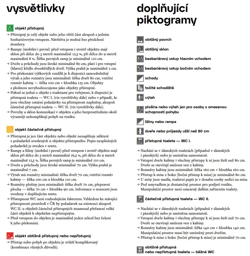 Terén na trase je místy opravdu náročný, často se setkáme s hrubou historickou dlažbou (tzv. kočičími hlavami), nezřídka narazíme na výrazný příčný sklon chodníku a některé kratší úseky budeme muset zdolat po vozovce. Odměnou všem dobrodruhům však bude odpočinek v tichých zahradách, ukrytých za zdmi malostranských paláců, i pohled na nevšední architekturu této půvabné čtvrti. Doprovod k prohlídce trasy rozhodně doporučujeme. délka trasy 2 km obtížnost obtížná Klárov → U Lužického semináře → Kampa → Okruh začíná u dopravního uzlu na Klárově. Tramvajová zastávka Malostranská je částečně přístupná, stejnojmenná stanice metra je bariérová. Trasa nás nejprve povede přes světelný přechod se sklopenými obrubníky v ulici Letenská, povrch ulice však tvoří hrubá dlažba, navíc je třeba překonat koleje. V ulici U Lužického semináře je chodník s převážně mozaikovou dlažbou a kombinací příčného a podélného sklonu (příčný sklon až 5 %, podélný sklon až 4 %), místy navíc musíme překonat vjezdy do přilehlých budov, které mají hrubý povrch a výraznější příčný sklon. Poměrně nenápadným vchodem v obvodové barokní zdi se dostaneme do Vojanových sadů. Mají charakter anglického parku a kromě okrasných stromů a tří barokních kaplí jsou zde nespornou atrakcí volně chovaní pávi. Součástí Vojanových sadů je dětské hřiště a hygienické zázemí s upravenou toaletou. K objektu veřejného WC však vede nevyhovující rampa (sklon až 18 %). Ulicí U Lužického semináře dospějeme až na malé náměstí. Od křížení s ulicí Míšeňská, kde po sklopeném obrubníku sjedeme z chodníku, budeme muset pokračovat po vozovce s hrubou historickou dlažbou. (Provoz vozidel je tu ale mírný a pohyb turistů po vozovkách je na Malé Straně běžným jevem, se kterým řidiči většinou počítají.) Trasa pokračuje pod obloukem Karlova mostu na Kampu, kde už povrch cest tvoří menší žulové kostky nebo asfalt. Kampa je malý ostrov, který od Malé Strany oddělil umělý vltavský kanál, tzv. Čertovka. Výstavbou původně Rožmberské strouhy se umožnila regulace průtoku vody pro mlýny, z nichž se do současnosti některé dochovaly. Jedním z nich je Sovův mlýn, kde dnes, po rozsáhlé rekonstrukci a moderní dostavbě, sídlí Museum Kampa se sbírkami výtvarných děl 20. století. Posezení s lavičkami a krásnou vyhlídku na řeku i Karlův most nabízí prostor u východní cihlové zídky. Přístup na veřejné toalety s dobře upravenou toaletou opět komplikuje nevyhovující rampa (sklon 15 %). → Maltézské náměstí → Prokopova → Karmelitská → Po asfaltové cestě se z Kampy vydáme přes most nad Čertovkou do tiché zahrady Nosticova paláce. Tou projdeme do Nosticovy ulice, kde musíme opět překonat klidnou vozovku s hrubou dlažbou. Pokračovat dále můžeme po pravém chodníku s dlažbou mozaikovou až na Maltézské náměstí. Jeho prostranství vymezuje řada menších paláců. Nejvýznamnější a největší z nich je barokní palác Nosticův, zdobený římsou se sochami imperátorů a rokokovým portálem. Využijeme přechod se sklopenými obrubníky při ústí Lázeňské ulice, abychom odbočili do ulice Prokopovy. Určitě se ale ohlédneme, abychom si alespoň z dálky prohlédli kostel Panny Marie pod řetězem, který patří mezi nejpozoruhodnější sakrální památky Prahy. Ulice Prokopova nás po pravém chodníku, který má místy velmi výrazný příčný sklon, přivede do Karmelitské ulice. Tou se můžeme malou zacházkou vlevo podívat ke kostelu Panny Marie Vítězné. Původně pozdně renesanční luteránský kostel byl po bitvě na Bílé hoře barokně přestavěn karmelitány. Památkou světové proslulosti je zde uctívaná vosková soška Pražského Jezulátka, španělská prác ze 16. století. Do konce března 2025 by měl být kostel bezbariérově zpřístupněn rampou. Opačným směrem nás Karmelitská ulice po pravém chodníku dovede na Malostranské náměstí, jehož dominantou je chrám sv. Mikuláše, vynikající dílo Kryštofa a Kiliána Ignáce Dientzenhoferů, otce a syna, skvělých stavitelů baroka. Kostel není bezbariérově přístupný. → Malostranské náměstí → Letenská → Klárov Podloubím při jihovýchodní straně Malostranského náměstí se přiblížíme k Mostecké ulici. Zde si opět můžeme udělat odbočku z trasy a zamířit na Karlův most. Vydáme se po pravé straně Mostecké ulice po širokém chodníku s mozaikovou dlažbou. Přechod přes ulici Lázeňská má sklopené obrubníky s výrazným sklonem (až 18 %), povrch vozovky, kterou překonává, tvoří hrubá dlažba. Před vstupem na most je sjezd z chodníku na vozovku. Úzký chodník v průjezdu pod Malostranskými mosteckými věžemi má výrazně omezenou průjezdovou šířku. Od sjezdu z chodníku v Mostecké ulici je tedy vhodné pokračovat po vozovce, která plynule přechází v pěší zónu. Na Malostranské náměstí se vrátíme stejnou cestou a pokračujeme kolem Kaiserštejnského paláce, domu U Flavínů a Malostranské besedy na východní straně náměstí. Odbočíme po pravém chodníku do Letenské ulice. Při pohledu na zprohýbaná průčelí Dientzenhoferem přestavěného kostela sv. Tomáše na protější straně si opět uvědomíme, proč se vrcholnému baroku říká také dynamické. Letenskou pokračujeme dál kolem budovy Ministerstva financí ČR, za níž přejdeme po přechodu se sklopenými obrubníky na druhou stranu ulice. Povrch vozovky opět tvoří hrubá dlažba, navíc je i zde třeba překonat tramvajové koleje. Dřevěná brána hned za přechodem nás zavede do barokní Valdštejnské zahrady, která patří mezi nejkrásnější pražská odpočinková místa. Je součástí rozlehlého 