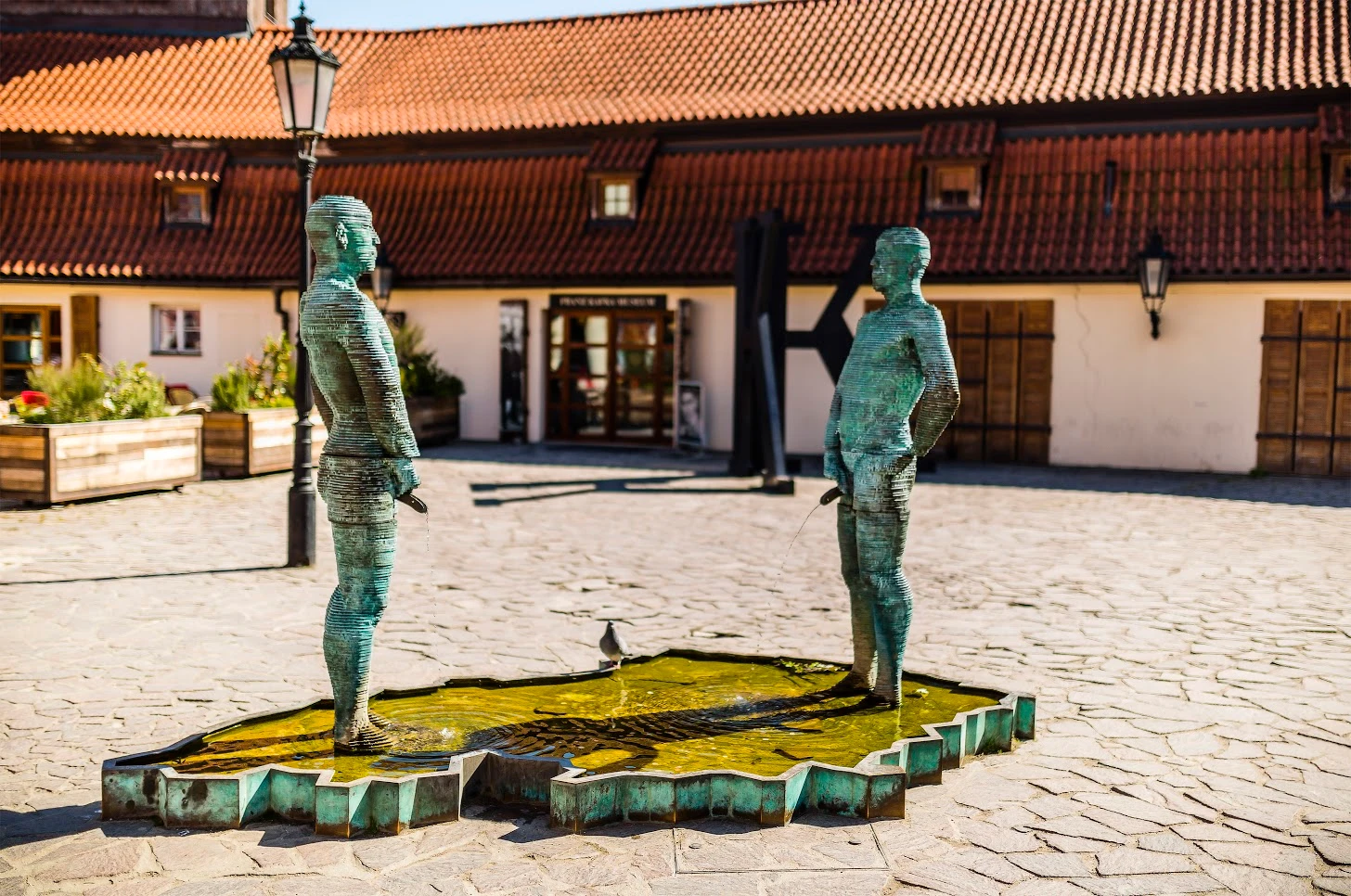 Ve dvoře Hergetovy cihelny narazíte na Čůrající postavy — dvojici obnažených mužských postav čůrajících do rybníku ve tvaru České republiky. Při důmyslnějším pozorování zjistíte, že sochy jsou ovládány elektronickým zařízením, které umožňuje natáčet boky a zvedat penisy tak, že proud vody na hladinu jezírka píše písmena. Autorem 220 cm vysokého sousoší je David Černý.