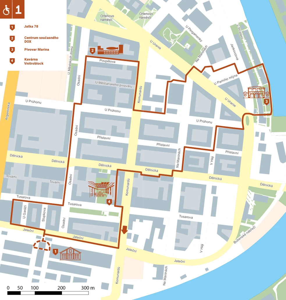 přehled o místě Vycházku pražskou čtvrtí, která snoubí dynamickou moderní výstavbu a zřetelnou stopu industriální minulosti, začneme na přístupné tramvajové zastávce Tusarova s nástupištěm vídeňského typu. Odtud se vydáme Jateční ulicí k severnímu vstupu do rozlehlého areálu Pražské tržnice. více o místě Zdroj: Prague City Tourism Terén na celé trase je vcelku bezproblémový. Až na ojedinělé výjimky tvoří povrch chodníků a cest rovná dlažba nebo asfalt bez závažnějších poruch. Všechny přechody mají po obou stranách upravené obrubníky, výraznější sklon a hrubý povrch je pouze u přechodů v ulici Jateční a Komunardů. Hrubý dlážděný povrch se nachází také v areálech Pražské tržnice a Holešovického měšťanského pivovaru, které lze případně vynechat. S ohledem na relativně dobrou přístupnost vybraných objektů doporučujeme jako doprovod spíše sympatického společníka pro posezení u kvalitní kávy nebo lokálního piva. popis trasy Obtížnost: střední Délka trasy 3,6 km |→ Pražská tržnice → Tusarova → Osadní → Centrum současného umění DOX Vycházku pražskou čtvrtí, která snoubí dynamickou moderní výstavbu a zřetelnou stopu industriální minulosti, začneme na přístupné tramvajové zastávce Tusarova s nástupištěm vídeňského typu. Odtud se vydáme Jateční ulicí k severnímu vstupu do rozlehlého areálu Pražské tržnice, kde hned v úvodu vycházky narazíme na dlážděný povrch s hrubšími nerovnostmi. Soubor budov se secesními a novorenesančními prvky, který sloužil do 80. let minulého století jako jatka, však za návštěvu rozhodně stojí. Dnešní využití areálu jako tržnice je pestré a zároveň osobité, zahrnuje velký potravinový a lihovinový trh, stánkařský prodej levného textilu, široký sortiment elektroniky, gastronomii, ale i alternativní projekty. Zastavit se můžeme například v bezbariérově řešeném uměleckém prostoru s kavárnou Jatka 78 zaměřeném na nový cirkus a alternativní divadlo, nebo na zeleninovém trhu v krásné secesní hale č. 22 s prudší rampou (sklon 13,5 %, šířka 360 cm, délka 270 cm) u vstupu. Areál tržnice opustíme stejným severním vstupem. Po přilehlém přechodu se sklopenými obrubníky přejdeme Jateční ulici, kterou pak pokračujeme do moderního komplexu komerčních a kancelářských budov ArtGen, v němž najdeme nejen malou parkovou plochu pro odpočinek, ale i občasné výstavy. Mezi budovami se protáhneme do Tusarovy ulice a po pravém chodníku se kolem domovních bloků v hravém rondokubistickém stylu vypravíme východním směrem. Na třetí křižovatce odbočíme doleva a octneme se v dnes už poklidné ulici Osadní, jejíž někdejší ruch připomíná několik bývalých továrních budov zasazených mezi prvorepublikové činžovní domy i moderní výstavbu. Zdařilou syntézu nového a starého najdeme například v čísle 35, které nese název HAM Factory. Rozsáhlá rekonstrukce zanedbaného vnitrobloku vdechla druhý život bývalé továrně na Pražskou šunku Josefa Jeřábka z konce 19. století. Přestavba areálu na polyfunkční objekt s kavárnou, ateliéry, byty a kancelářemi je dílem úspěšného designového studia Olgoj Chorchoj. Při křížení s ulicí U Průhonu přejdeme z levého chodníku po upraveném přechodu se sníženými obrubníky na pravý a pokračujeme až k dalšímu podařenému projektu, bývalé fabrice na stroje Rossemann a Kühnemann, v níž také ve 20. letech 20. století krátce sídlila továrna na výrobu letadel Avia. Neutěšeně chátrající objekt se počátkem milenia proměnil na čistou, minimalisticky pojatou galerii moderního umění DOX. Bezbariérové prostory nabízejí nejen zajímavé výstavy, ale i stylovou kavárnu, knihkupectví a designový obchod. Nespornou atrakcí centra je také dřevěná více než čtyřicet metrů dlouhá vzducholoď Gulliver umístěná na střeše budovy. Ta sice bezbariérový přístup nemá, ale půvaby její ocelovo-dřevěné konstrukce lze za pěkného počasí obdivovat z venkovní terasy galerijní kavárny. → Holešovický měšťanský pivovar → Holešovický přístav → Z DOXu se vydáme na rušnější ulici Komunardů, kde najdeme kulturní památku Holešovický měšťanský pivovar z konce 19. století, který vařil pivo až do roku 1998. Areál slouží od nedávné citlivé rekonstrukce jako administrativně-obytný komplex, jehož exteriér ovšem stojí za vidění. Vstupem z ulice U Průhonu se dostaneme na jeho rozlehlý dvůr, jímž můžeme projít do ulice U Uranie. Na tomto úseku musíme ale počítat s hrubou dlažbou a výraznějšími spárami (těm, co dělá hrbolatý povrch potíže, doporučujeme areál raději obejít ulicemi U Průhonu a Na Maninách). Po upraveném přechodu se sníženými obrubníky přejdeme ulici U Uranie a před námi bude další kancelářsko-obchodní komplex Classic 7, který představuje opět zajímavý příklad oživení staré zástavby. Cesty protínající areál bývalého Holešovického automatizovaného mlýna mají dobrý povrch z různých materiálů, betonovou dlažbu střídá dřevěný rošt nebo mozaiková dlažba. Abychom se později vyhnuli schodišti, spustíme se z dřevěné terasy dolů po dlážděném chodníku s podélným sklonem (7,5 %) k prosklené budově L, podél jejíž fasády pokračujeme do Jankovcovy ulice. Po nejbližším přechodu u křížení s ulicí U Parního mlýna se vydáme průchodem bytového komplexu Prague Marina na další svébytné holešovické místo — do přístavu. Přístav byl celý vyhlouben uměle a sloužil původně jako přístav ochranný a zimní, až později jako obchodní. Roku 1906 u něj bylo vybudováno seřaďovací nádraží. V témže roce bylo postaveno několik jednopatrových budov s 