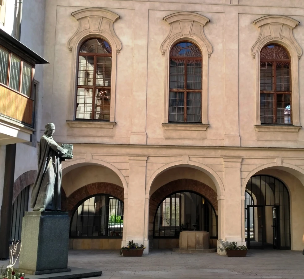 přehled program o místě Jedinečná památka náleží Univerzitě Karlově od roku 1383, kdy syn zakladatele univerzity, král Václav IV., získal pro kolej jeden z nejvýstavnějších staroměstských paláců. Dnešní vzhled Karolina je převážně barokní. Ústředním prostorem interiéru je Velká aula sloužící akademickému dvoru a promocím studentů. Prostory Křížové chodby jsou využívány k výstavám současného umění. Prohlídky reprezentačních prostor se nepořádají ani na objednávku, jsou přístupné pouze při významných příležitostech. více o místě Zdroj: Prague City Tourism Historie Univerzity Karlovy 8. 4. 2015 — 31. 12. 2030, 00:00 Karolinum historie Založení Karlovy univerzity 7. 4. 1348 patří mezi nejvýznamnější státnické činy Karla IV. V zakládací listině vyhlásil, že univerzitu zakládá proto, aby se obyvatelé Českého království nemuseli v cizině doprošovat almužny a aby nalézali doma hostinu vědění a naopak mohli zvát cizince k účasti na studiu u nás. Zpočátku univerzita neměla ústřední budovu. Studenti bydleli u svých profesorů, s nimi se i stravovali, přednášelo se v kostelích, klášterech i v soukromí. Později vznikly různé univerzitní koleje, dnešní Karolinum bylo jen jednou z nich. R. 1366 byla založena Karlova kolej a po dvaceti letech se nastěhovala do gotického patricijského domu mincmistra Rotleva z doby kolem r. 1350. Johlin Rotlev daroval dům Václavu IV. a ten jej ještě se sousedními domy předal Karlově koleji, která původně sídlila v domě na okraji židovské čtvrti vedle kostela sv. Mikuláše, jehož prostory byly velmi omezené. Nové objekty byly obestavovány a rozšiřovány, důležité bylo zřízení univerzitní kaple a velkého sálu pro slavnostní shromáždění – aula magna. Středověká přestavba trvala mnoho let a dala tehdy univerzitě auly, posluchárny, byty mistrů a jejich pomocníků, i lázně a vězení. V r. 1611 byly všechny jednotlivé koleje zrušeny a vše se soustředilo v objektech Karlovy koleje – Karolina. Působil zde jako profesor a rektor mistr Jan Hus. V aule Karolina vystoupil se svým přítelem Jeronymem při veřejné rozpravě proti papežskému prodeji odpustků. Univerzitní mistři se podíleli na vyhlášení husitských reformních požadavků Čtyř artikul pražských r. 1420. Několikrát se zde sešel zemský sněm a v r. 1618 se odsud po zasedání vydali čeští stavové na Hrad k defenestraci místodržících Slavaty a Martinice. Univerzita se stala jedním z center reformního hnutí, za což byla potrestána po porážce stavovských vojsk na Bílé Hoře vítězným Ferdinandem II. tím, že byla předána Jezuitům. Ti spojili Karolinum se svou kolejí v Klementinu. Dnešní vzhled Karolina je převážně barokní tak, jak je roku 1718 přestavěl František Maxmilián Kaňka. Barokní charakter je doplněn dochovanými a částečně nově odkrytými gotickými prvky. Nad barokním Kaňkovým portálem směrem do Železné ulice bylo ponecháno raně barokní okno z r. 1687 s nápisem LEX CIVIUM DUX (Zákon je vládcem občanů). Z původního Rotlevova domu pochází loubí a gotický arkýř z doby kolem r. 1370, který byl původně součástí domácí kaple sv. Kosmy a Damiána a jemuž se výstavností rovná jen arkýř Staroměstské radnice. Kaple je ozdobena znaky Čech, Štýrska, Moravy, arcibiskupa Jana z Jenštejna a Johlina Rotleva. Po roce 1930 začal stavebně historický a archeologický průzkum, který potvrdil, že pod barokní přestavbou zůstaly památky na středověkou podobu. Válka práce zastavila, proto rekonstrukce začala až koncem 40. let pod vedením architekta Jaroslava Fragnera. Rekonstrukce zasahovala nejen do samotné historické budovy Karolina, ale i do dalších domů karolinského bloku. Celkem jich ke Karolinu patří 17 včetně dvorních objektů. Patří mezi ně Buquoyský palác a Opitzův dům, v nichž byly objeveny trámové malované stropy, dům zv. Stokhaus a další. Nejnáročnější etapa rekonstrukce skončila koncem 50. let úpravou nádvoří do původní gotické podoby s cihlovými arkádami a pavlačí. Byla zde osazena socha Jana Husa od Karla Lidického. Druhá etapa Fragnerovy obnovy a rekonstrukce se týkala úpravy přilehlých domů a výstavby nové vstupní budovy v 60. letech. Byl upraven čestný dvůr a v r. 1975 na něm byla osazena fontána zdobená heraldickými lvy podle projektu Jaroslava Fragnera a sochaře Vincence Makovského vytesaná sochařem Josefem Wagnerem. Ústředním prostorem interiéru je velká aula sloužící akademickému dvoru, který zde zasedá při univerzitních slavnostech, a k promocím studentů. Při obnově v letech 1946 – 50 byla aula, vybudovaná po r. 1383 asi o třetinu prodloužena, byly sem umístěny tribuny a křesla pro akademický dvůr. Aula má zvláštní vlnitý strop, který zajišťuje výtečnou akustiku a na němž jsou kovové znaky českých zemí podle návrhu Jana Laudy. Do lustrů jsou vmontována oteplovací tělesa a ampliony. Hlavní stěna je ozdobena gobelínem Vladimíra Sychry z r. 1947, jehož hlavním motivem je Karel IV. klečící před knížetem Václavem. Motiv je stejný jako na univerzitní pečeti. Před gobelínem nalevo je bronzová nadživotní postava Karla IV., dílo Karla Pokorného. Na boční stěně auly je gobelíny zdobená dvojitá kruchta s varhanami. Gotický portálek nad kruchtou vede k celé řadě komnat. V jedné z nich chová univerzita cenné listiny, pečeti a insignie – výsostné univerzitní znaky. Na druhé straně auly je malá kaple, vybíhající do ulice gotickým arkýřem, zdobená mramorovým památníkem humanisty mistra Matouše Kolína z Chotěřiny z r. 1568. Od barokního Kaňkova portálu ze Železné ulice vede k aule původní schodiště zdobené malbami Richarda Wiesnera, druhé schodiš