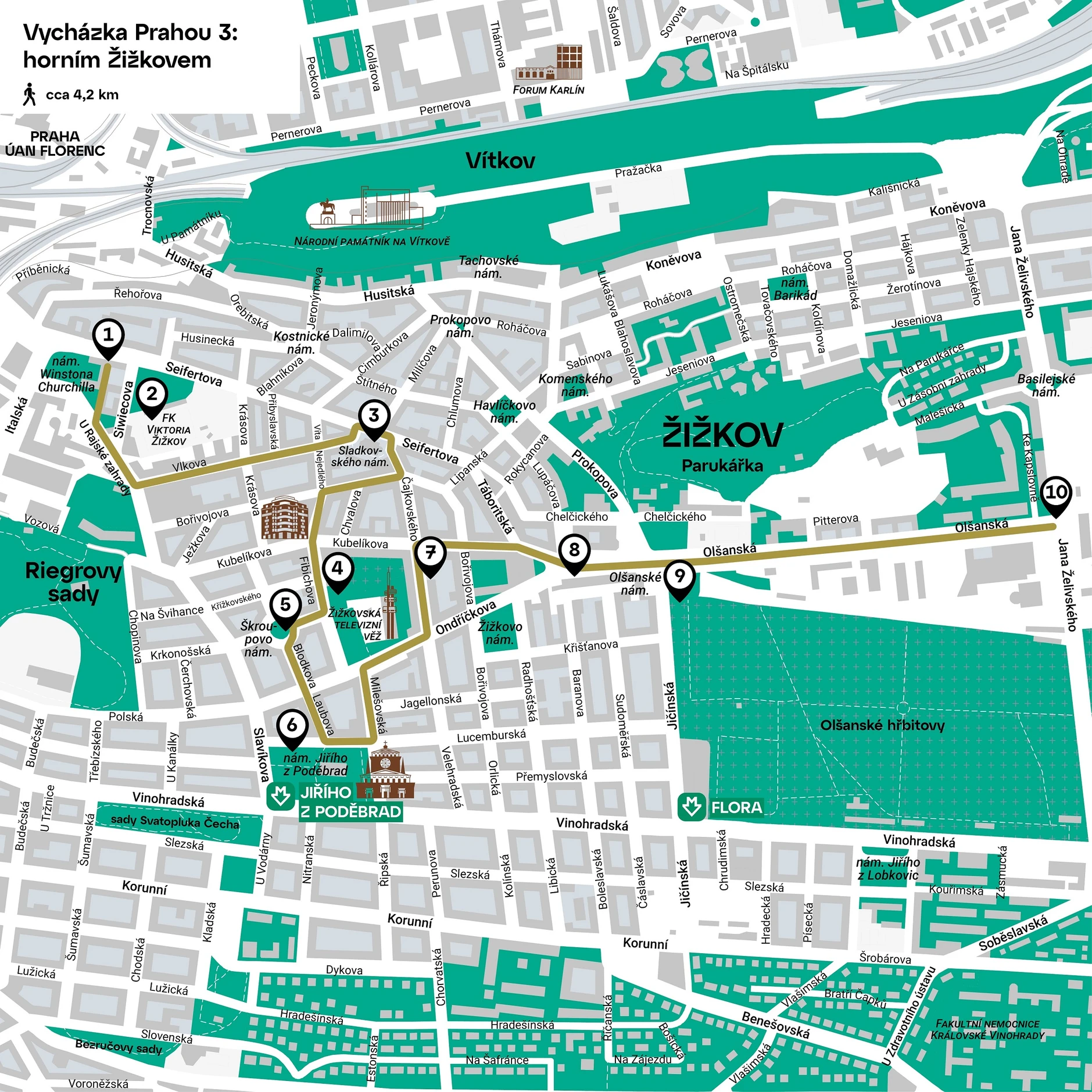 Průvodcem po naučné stezce vám budou jednotlivé informační tabule, které popisují dané místo a okolí, zajímavé okamžiky z jeho historie i současnosti doplněné obrazovým materiálem s popisky. Naučná stezka „Nejzajímavější místa Trojky a její proměny v 19. a 20. století“, kterou pro vás připravila Radnice Prahy 3, přináší ucelený obraz o urbanismu, vývoji a charakteru, klíčových změnách zástavby, či významných osobnostech a událostech s nimi spojených. První část nenáročné vycházky můžete začít na Churchillové náměstí, ale začnete-li jinde nebo si procházku dále rozdělíte, nevadí. Informační tabule nejsou číslované a obsahově na sebe nenavazují. Uspořádali jsme je zde pro vás tak, abyste žádnou z nich neminuli. Trasu jsme rozdělili na dvě poloviny — horní a dolní Žižkov. Délka trasy 4,2 km → Seifertova ul. → 1 nám. Winstona Churchilla Trasa začíná u náměstí Winstona Churchilla (mezi zastávkami tram Hlavní nádraží a Viktoria Žižkov), které mají asi nejvíce prozkoumané studenti Vysoké školy ekonomické, jejíž budova se nachází v průčelí. Náměstí je pojmenováno podle významného britského státníka Winstona Churchilla — jeho socha zde byla odhalena v r. 1999. Na rohu náměstí a Seifertovy ulice upoutá nově zrekonstruovaná funkcionalistická stavba bývalého Všeobecného pensijního ústavu, poté Domu odborových svazů, nyní Domu Radost. Budova postavená v roce 1934 na křížovém půdorysu se stala se svými 52 m první pražskou výškovou budovou. Z její, v letní sezóně veřejně přístupné střechy, je unikátní výhled nejen na oblast Žižkova. → 2 Siwiecova ul. U bočního vchodu na domácí stadion fotbalového mužstva FK Viktoria Žižkov se můžete seznámit s nejslavnější érou žižkovského klubu. → ulice U Rajské zahrady Náš tip: než odbočíte do Vlkovy ulice, vpravo je jeden ze vchodů do Rajské zahrady. Odměnou vám bude po krátkém stoupání krásný výhled od altánku, můžete se protáhnout na fitness prvcích či posilnit v kavárně v dolní části parku. → Vlkova ul. → 3 Sladkovského náměstí Úpatí tzv. horního Žižkova vévodí novogotická chrámová stavba Josefa Mockera — kostel sv. Prokopa. Výška křížové klenby dosahuje 16 metrů, věž je vysoká 73 metry. Mohutná novorenesanční budova gymnázia Karla Sladkovského, jedné z nejstarších středních škol v Praze, obklopuje kostel po celé jižní straně náměstí. Díky vysoké úrovni výuky i množství známých absolventů se dříve gymnáziu přezdívalo „žižkovská Sorbonna“. → Čajkovského ul. → Bořivojova ul. → ulice Víta Nejedlého → 4 Fibichova ul. Cestou k dalšímu zastavení budete míjet Palác Akropolis, víceúčelovou budovu s prvky novoklasicimu a art deco, a impozantantní budovu někdejší Meziměstské a mezinárodní telefonní ústředny, obě z 20. let minulého století. Park Mahlerovy sady je místem doteků doby minulé, dochované v nenápadné části starého židovského hřbitova, a moderní technické konstrukce v podobě žižkovského televizního vysílače. Starý židovský hřbitov byl založen v roce 1680 jako morové pohřebiště Pražské židovské obce a je významnou historickou památkou. Bylo zde pohřbeno na 40 000 osob, mezi nimi řada významných rabínů a učenců. Bezesporu hlavní dominanta Žižkova, potažmo celé Prahy, Žižkovská televizní věž, je se svými 216 m nejvyšší stavbou metropole. Autory projektu z 80. let 20. století jsou architekti V. Aulický a J. Kozák. Na konstrukci věže jsou umístěny obří sochy miminek od českého umělce Davida Černého. Podařilo se vám napočítat všech 10? → Pospíšilova ul. → 5 Škroupovo náměstí Lidové označení „horní“ Žižkov se vztahuje k lokalitě, jejíž pomyslný střed tvoří Škroupovo náměstí, a která představuje přechod mezi typickým starým Žižkovem a Vinohrady. Ačkoli se to nezdá, toto kruhové náměstí s kruhovým parkem uprostřed má průměr 150 metrů. V jeho okolí se rozvinula zástavba typická pro Vinohrady v podobě modernějších a velkorysejších pravidelně vymezených bloků. V novodobé historii vstoupilo do dějin jako místo první povolené disidentské manifestace, kterou svolala Charta 77 v prosinci roku 1988, a na níž veřejný politický projev požadující propuštění politických vězňů pronesl Václav Havel. → Blodkova ul. → Laubova ul. → 6 nám. Jiřího z Poděbrad Hlavní plochu náměstí zaujímá městský park, vytvořený v 19. a 20. století na místě původních zahrad. Od roku 1932 prostoru dominuje kostel Nejsvětějšího Srdce Páně, nejvýznamnější česká sakrální stavba 20. století. Moderní a velmi osobitá stavba podle projektu slovinského architekta Josipa Plečnika upoutá velikým kulatým oknem v 42 metrů vysoké ploché věži založené v celé šíři stavby. Původně propouštělo ranní světlo do chrámu, později v něm byly osazeny hodiny o průměru 7,6 m. Plečnik se do jisté míry podílel i na interiéru kostela, který je stejně originální jako exteriér. Další výraznou stavbou náměstí je bílá budova základní školy z roku 1913. Žulová kruhová fontána Sjednocená Evropa vybudovaná v rámci výstavby stanice metra Jiřího z Poděbrad v roce 1981 je dílem Petra Šedivého. → Milešovská ul. → Ondříčkova ul. → 7 Čajkovského ul. Atrium, jedinečné kulturní centrum ukryté mezi bytovými domy, vzniklo v zrekonstruované barokní kapli. Chrámová loď byla upravena na koncertní síň a k barokní stavbě byla připojena moderní přístavba s výstavním prostorem. Uprostřed čtvercového atria se na místě bývalé roubené studny nachází kašna v podobě mušle s plastikou Sedící dívka. Nad vstupem shlíží na pří