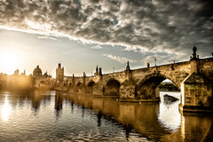 stránka O staroměstském orloji Na Staroměstské radnici už šest set let ukazuje čas staroměstský orloj. Původní jednoduchý mechanismus sestrojil před rokem 1410 Mikuláš z Kadaně. Koncem 15. století zdokonalil hodinový stroj mistr Hanuš z Růže tak, že byl v celé Evropě jedinečným dílem, kterému nebylo rovného. stránka O ohnivém muži V Karlově ulici žil kdysi starý lichvář. Půjčoval lidem v nouzi peníze, ale úroky měl tak vysoké, že půjčku jen málokdo dokázal splatit. Lichvář ale neznal slitování, nejednoho chudáka dokázal připravit i o střechu nad hlavou. Jak rostlo jeho bohatství, rostl i jeho strach o peníze: s nikým se nestýkal, z domu skoro nevycházel, a když už ho sousedé zahlédli na ulici, neodpověděl ani na pozdrav. Každého večera se v jeho domku dlouho svítilo, jak přepočítával zlaťáky ze své truhlice. stránka O mostě z vajec a tvarohu V dávných dobách, než byl postaven první most přes Vltavu, vozy jezdily přes řeku několika brody. Také mnoho převozníků tu provozovalo své řemeslo. Staré kroniky zachovaly vyprávění o velké lodi bájného knížete Křesomysla z 9. století, kterou se pohodlně převáželi na druhý břeh lidé i vozy. V 10. století už ale vedl přes Vltavu první dřevěný most. A roku 1158 tu byl první most kamenný, ve své době učiněný div světa. stránka O Bruncvíkovi Třicet sousoší světců bylo na Karlův most usazeno až v polovině 18. století. Sochařská díla na výzdobu mostu objednávali šlechtici, církev, pražská obec i vysoké školy. Autory soch byli významní umělci té doby, mnohé pochází od Matyáše Brauna a Jana Brokoffa a jeho synů. Už dlouhá staletí Pražané trápí cizince otázkou: Kolik je soch na Karlově mostě? Napohled jednoduchá otázka je záludná: soch na mostě není třicet, ale jedenatřicet. Jedenatřicátou sochou je Bruncvík se zlatým mečem, stojící na mostním pilíři na Kampě. stránka O Hladové zdi Jednoho roku za panování Karla IV. udeřilo velké sucho, které bylo příčinou neúrody a tím i nedostatku potravin. Zvláště ve městech vyšplhaly ceny mouky a chleba tak vysoko, že si je chudáci nemohli dovolit. Mnozí proto začali krást a loupit, aby jejich rodiny nezemřely hlady. Zakrátko byly žaláře v Praze plné. stránka O Daliborce Ještě dnes působí Pražský hrad dojmem středověké pevnosti, je to patrné zvláště při pohledu od Jeleního příkopu, odkud je dobře vidět důkladné gotické opevnění z doby krále Vladislava Jagellonského z 15. století. Stojí tu také obranné věže Daliborka, Bílá věž a Mihulka. Když bylo potřeba, věže sloužily i jako vězení. V tomto ohledu se nejvíc proslavily temné kobky a hladomorna ve věži Daliborce, která nese jméno po svém nejslavnějším vězni – Daliborovi z Kozojed. stránka O nejstarší pražské synagoze Když přišli Židé do Prahy, určil jim panovník místo na pravém břehu Vltavy, kde se směli usadit. Ještě než se pustili do stavby domků pro své rodiny, radili se, jak co nejrychleji postavit synagogu. Dohadování nemělo konce, až se slova ujal jeden moudrý stařec. Poradil ostatním, aby začali kopat na nedalekém pahorku. Potom prý sami uvidí, jak synagogu získat. stránka O Faustově domě V rohu Karlova náměstí proti klášteru Na Slovanech stojí starobylý dům, spíš malý palác. Patřil prý kdysi doktoru Faustovi, o kterém se vyprávělo, že upsal duši ďáblu. Čert si jedné noci pro něj přišel a po Faustovi zůstala jen očouzená díra v jednom z pokojů. Nikdo ji nedokázal zazdít, protože přes noc zdivo vždycky popadalo. A tak dům zůstával opuštěný a každý se v něm bál třeba jen přenocovat. Až student jménem Mladota se do Faustova domu odvážil. stránka O Libuši a Přemyslovi Pověst vypráví, že první Slovany na naše území přivedl vojvoda Čech, podle kterého byla země pojmenována. Po Čechovi se vlády ujal Krok, a když zemřel, zůstaly po něm tři dcery: Kazi, Teta a Libuše. Kazi se vyznala v léčivé moci bylin, proto uměla pomoci lidem od nejrůznějších nemocí a zranění. Teta dobře znala staré obřady a učila lid správně uctívat bohy přírody. Nejmladší Libuše byla nejmoudřejší, uměla věštit a poznávat budoucnost. Proto ji po Krokově smrti stařešinové vyzvali, aby spravovala zemi. Libuše přijala a usídlila se na vysoké skále nad Vltavou na hradě jménem Vyšehrad. stránka O založení Prahy Jednoho letního odpoledne se Libuše s Přemyslem a jejich družinou dívali z hradeb Vyšehradu. Slunce se sklánělo k západu a jeho paprsky zalévaly okolní krajinu zlatem.