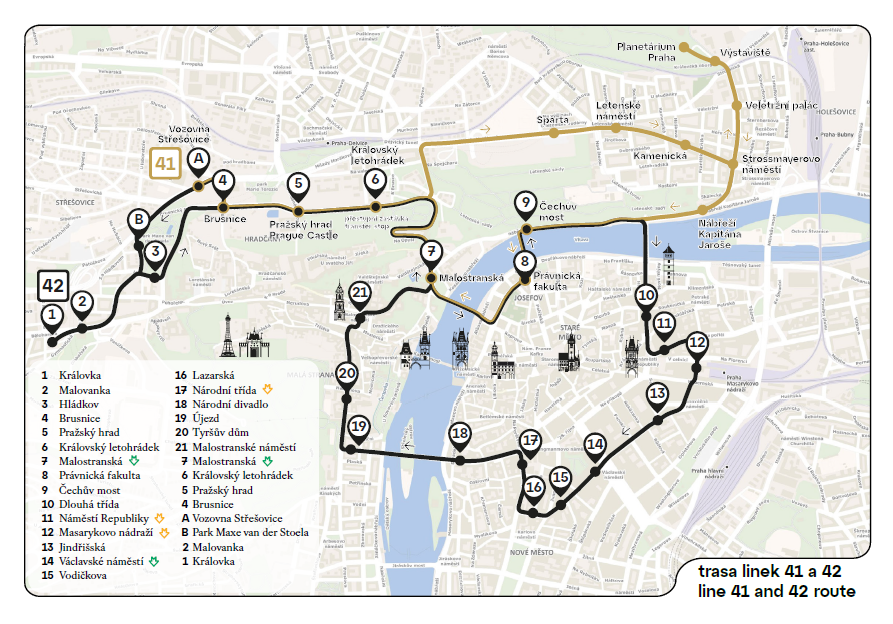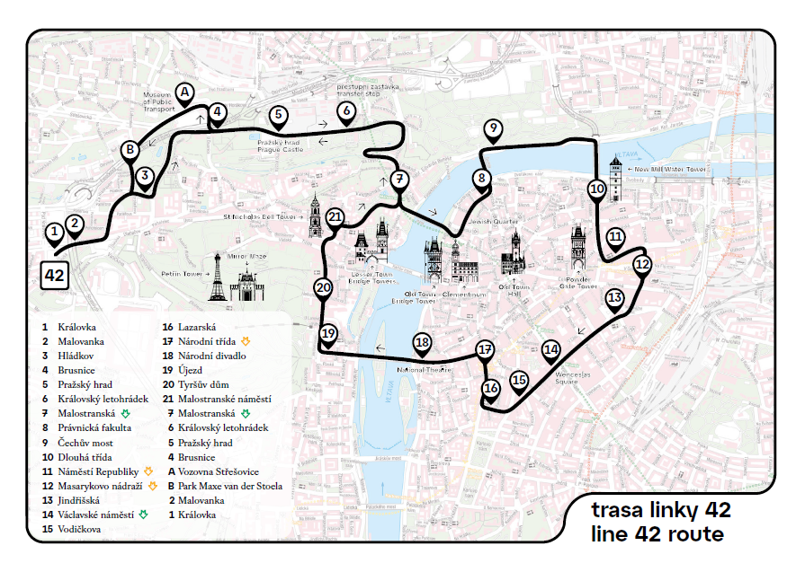 Änderung Linienweg 3. November — 16. November 2025 Die historische Straßenbahn 42 wird über die Haltestellen Královka, Malovanka, Park Max van der Stoel und Vozovna Střešovice umgeleitet. Die Straßenbahn fährt um 10.04 Uhr und auch um 10.44 Uhr von der Haltestelle Pražský hrad ab. Die weiteren Fahrten beginnen an der Haltestelle Královka. Fahrplan ab dem 17. Nobember 2025 ganze Woche 10:00—18:00 Intervall 40 Minuten Abfahrt von Dlabačov 10:00 | 10:40 | 11:20 | 12:00 | 12:40 | 13:20 | 14:00 | 14:40 | 15:20 | 16:00 | 16:40 | 17:20 Wochen Strecke Wochenend Strecke