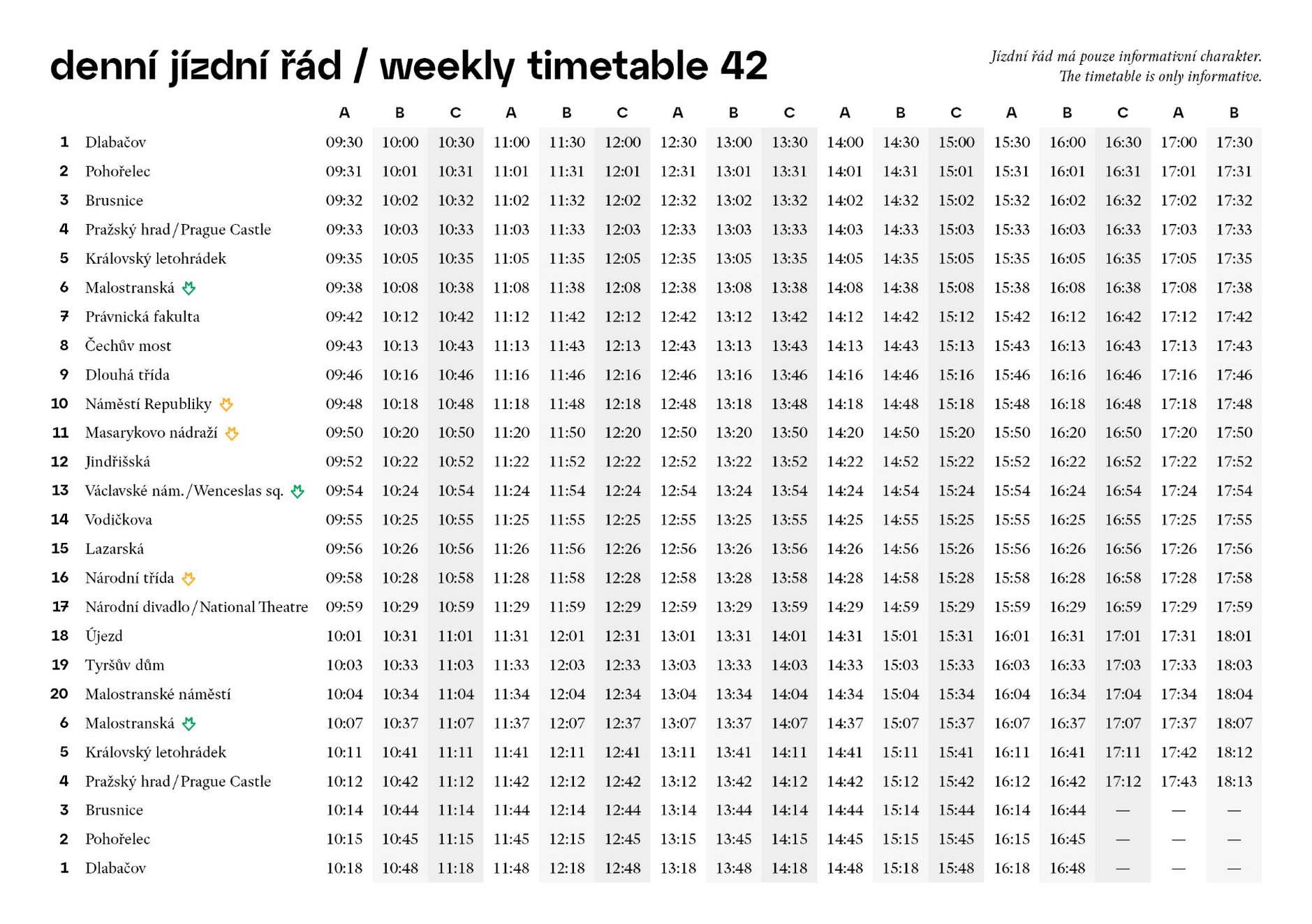 29. 11. 2025 — 4. 1. 2026 ganze Woche 9:30—18:15 Intervall 30 minutes Abfahrt von Dlabačov 9:30 | 10:00 | 10:30 | 11:00 | 11:30 | 12:00 | 12:30 | 13:00 | 13:30 | 14:00 | 14:30 | 15:00 | 15:30 | 16:00 | 16:30| 17:00 | 17:30 vom 5. Januar 2026 ganze Woche 10:00—18:00 Intervall 40 Minuten Abfahrt von Dlabačov 10:00 | 10:40 | 11:20 | 12:00 | 12:40 | 13:20 | 14:00 | 14:40 | 15:20 | 16:00 | 16:40 | 17:20 strecke Dlabačov → Pohořelec → Brusnice → Pražský hrad → Královský letohrádek → Malostranská → Právnická fakulta → Čechův most → Dlouhá třída → Náměstí Republiky → Masarykovo nádraží → Jindřišská → Václavské náměstí → Vodičkova → Lazarská → Národní třída → Národní divadlo → Újezd → Tyršův dům → Malostranské náměstí → Malostranská → Královský letohrádek → Pražský hrad → Brusnice → Pohořelec → Dlabačov.
