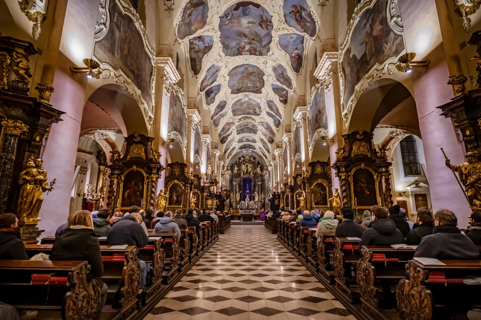 Übersicht Über den Ort Der Kern der Kirche inmitten des Prämonstratenser-Klosters am Strahov ist eine romanische Basilika mit einem gotischen Seitenschiff und zwei Renaissance-Türmen, die barock hergerichtet sind. Die heutige barocke Gestalt hat die Kirche in den Jahren 1742—1758 erhalten. An den Wänden des Hauptschiffs befinden sich in den Kartuschen Fresken mit Szenen aus dem Leben des Heiligen Norbert, des Gründers des Ordens. Mehr zum Ort Regelmäßige römisch-katholische Gottesdienste: Mo—Sa 7:15, 18:00 So: 10:00; 18:00 Besichtigungen des Inneren der Kirche nur auf vorherige Anfrage (tagsüber ist die Kirche außerhalb der Messezeiten gewöhnlich geschlossen) Konzerte klassischer Musik Geschichte Die Kirche Mariä Himmelfahrt ist im Kern eine romanische Dreischiffbasilika mit einem gotischen im Jahre 1627 verlängerten Querschiff und mit einem Renaissancepresbyterium. Die Kirche entstand im 3. Viertel des 12. Jahrhunderts. In den Jahren 1258—1263 gewann sie ihre gotische Gestalt, die ganze Jahrhunderte überdauerte. Die historische Untersuchung in den 50er Jahren des 20. Jahrhunderts erwies weder einen vernichtenden Brand im 13. Jahrhundert noch eine Zerstörung in den Hussitenzeiten. In den Jahren 1601—1605 kam es unter dem Abt Lohelius zum Renaissanceumbau, dessen Autor offenbar G. Bossi de Campione ist. Nach der Beschädigung durch den Beschuss und das Geschützfeuer wurden im Jahre 1742 spätbarocke Umgestaltungen an der Kirchenfrontseite (T. Haffenecker, A. Lurago, bildhauerische Ausschmückung Johann Anton Quittainer) sowie im Innenraum vorgenommen: Fresken aus dem Leben des Hl. Norbert und Erscheinungen aus dem Leben der Jungfrau Maria vom schlesischen Maler Wilhelm Neuenherz (1743). Für die Stuckverzierung sorgte Johann Ignaz Palliardi, der Hauptaltar sowie 10 Seitenaltäre wurden vom bekannten Prager Steinmetz Josef Lauermann (1769) geschaffen. Die Skulpturen des Hauptaltars machte Ignaz Platzer, die Skulpturen der Seitenaltäre J. A. Quittainer. Die Altargemälde malten überwiegend M. Leopold Willmann, F. Xaver Balko und Siard Nosecký. Bereits von Anfang an wurden den Kirchen Kapellen angebaut. Inmitten des Schiffs ist die Kapelle der Jungfrau Maria von Passau (an der Stelle der gotischen Kapelle der heiligen Engel aus dem 14. Jahrhundert). Albrecht von Waldstein ließ sie für den kaiserlichen General Pappenheim und seinen Neffen Berthold bauen, die in der Schlacht bei Lützen fielen. Am Altar ist die Kopie des Jungfrau Maria von Passau Gemäldes und an der Decke die Freske „Schlacht bei Lützen“ von Siard Nosecký. Auf der Gegenseite der Kirche ist die größere ursprünglich gotische Kapelle der Heiligen Ursula. Sie hat den Altar der Heiligen Ursula und den Altar des Heiligen Norberts, des Gründers des Prämonstratenser-Ordens und des Landesschirmherren, dessen sterbliche Überreste auf Strahov vom Magdeburger Prämonstratenserklosters im Jahre 1627 überstellt wurden und in dieser Kapelle beigesetzt sind. In der Kirche wurden 1174 auch ihr Mitgründer Wladislaus II. und vorher seine Frau Gertrude, genauso wie der andere Mitgründer Jindřich Zdík (verstorben 1150) beigesetzt. Bei der archäologischen Untersuchung wurden ihre Gräber jedoch nicht gefunden. In der Kirche waren berühmte Orgelspieler wie Jan Křtitel Kuchař und Robert Führer tätig. Im Jahre 1787 spielte hier W. A. Mozart seine Orgelimprovisationen. Die Originalorgel wurde nach 1900 durch eine andere ersetzt. Der Papst Johannes Paul II. erteilte der Maria Himmelfahrt Abteikirche den Titel Basilica minor (kleinere Basilika). Die Beförderungsfeier fand am 1. und 2. Februar 1992 statt.