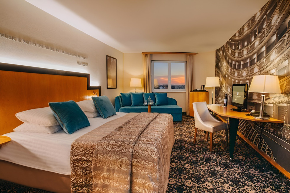 Be enchanted by Don Giovanni Hotel Prague, inspired by music and theatre, located on the border of Vinohrady and Žižkov. Its unique Mozart-inspired atmosphere is enhanced by live piano concerts held every evening. The rooftop terrace offers picturesque views of Prague. For relaxation, guests can enjoy a wellness centre with a whirlpool, saunas, Thai massages and a hair salon. The historic city centre can be easily reached within 10 minutes by any means of transport. Dine & Drink: Amadeus Bar — cocktails, selection of wines, coffee Executive Lounge & Sport Gallery — rooftop terrace views of Prague, connected to the hotel library Allegretto Restaurant Teatro Restaurant Conferences: 15 meeting rooms Largest hall for up to 500 persons Total capacity up to 1,000 people Part of the CZECH INN HOTELS chain