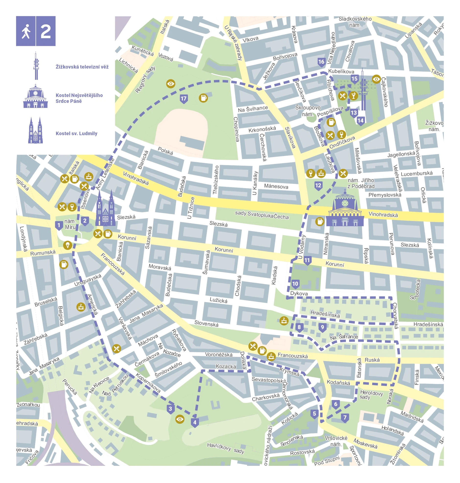 Die Häuser mit den verzierten Fassaden, die mit Bäumen gesäumten Straßen, die malerischen Parks mit Aussicht und die idyllische Atmosphäre, die leicht an Paris erinnert sind die Gründe, warum in Vinohrady immer schon die Prager Elite gewohnt hat. Heute ist dieses kosmopolitische Viertel abgesehen von den Mietpreisen auch für seine guten und gemütlichen Restaurants, Weinlokale und Kaffeehäuser bekannt. Die Route führt Sie auch in das angrenzende Vršovice und nach Žižkov — zwei beliebte Prager Viertel welche reges kulturelles und gesellschaftliches Leben mit einer Menge Gasthäuser, Bars und verschiedenster Clubs verbinden. Länge der Route 7 km |→ 1 náměstí Míru / Friedensplatz (U-Bahn-Station „Náměstí Míru“, Linie A) → 2 Kirche Hl. Ludmila Der zentrale Punkt Vinohradys ist dieser Platz mit der neugotischen Hl. Ludmila Kirche (kostel sv. Ludmily) in seiner Mitte. Bedeutende Gebäude sind auch das Theater in den Weinbergen (Divadlo na Vinohradech) aus dem Jahr 1907 und das Nationalhaus Vinohrady (Národní dům na Vinohradech), wo Konferenzen, Konzerte und Bälle stattfinden. → Americká Straße → Koperníkova Straße → 3 Havlíček Park Havlíček Park war von der italienischen Renaissance inspiriert. Die Grotte, der Springbrunnen, die Wasserkaskaden und der kleine See erzeugen eine romantische Atmosphäre, welche der charmante Holzaltan inmitten des Weinbergs noch verstärkt. Der gesamte Komplex wird von einer herrschaftlichen Villa mit Terrasse mit Ausblick in die weitere Umgebung dominiert. → 4 Villa Grébovka → Rybalkova Straße → Kozácká Straße → Donská Straße → Krymská Straße Die Leser der New York Times wissen, dass die unauffällige und ein bisschen schmuddelige Krymská Straße das Prager Zentrum alternativer Kultur und die coolste Adresse der Stadt ist. Sie finden hier eine Reihe von Lokalen, die den Kaffeehausbetrieb mit Kultur und bisher auch sehr authentischem — aber nicht zu wildem — Nachtleben verbinden. Wir empfehlen, gegen Abend zurückzukehren. → Moskevská Straße → 5 Hl. Nikolaus Kirche → 6 Heroldovy sady/Park → 7 Rangherka → Kodaňská Straße → Norská Straße → Ruská Straße → Chorvatská Straße → Na Šafránce Straße → Slovenská Straße → 8 Atelier Šaloun → Hradešínská Straße → 9 Villa Kotěra Ihre Aufmerksamkeit wert ist das Jugendstilatelier des tschechischen Bildhauers Ladislav Šaloun, Schöpfer der Statuengruppe Jan Hus‘ am Altstädter Platz, sowie die Villa des modernistischen Architekten Josef Kotěra. → Chorvatská Straße → Dykova Straße → 10 Hus Haus Vinohrady Das Hus Haus Vinohrady, ein unkonventionelles, funktionalistisches Gebäude, das aus drei Teilen besteht — dem Festsaal, dem Wohnhaus und dem Glockenturm — gehört zu den bedeutendsten Projekten des tschechischen Architekten Pavel Janák. 6 Fotos zeigen → U Vodárny Straße → 11 Vinohrady Wasserturm Der romantische ehemalige Wasserturm, in dem sich Pumpen und Wassertanks befanden, erfüllte diese Funktion bis 1962. → Vinohradská Straße → 12 Platz des Georg von Podiebrad Auf den Platz kommend packt einen sofort die ungewöhnliche monumentale Architektur der Kirche des heiligsten Herzens des Herrn (kostel Nejsvětějšího Srdce Páně), das Werk des slowenischen Architekten Jože Plečnik, der auch für die moderne Rekonstruktion der Prager Burg verantwortlich zeichnet. Die Kirche ist der bedeutendste Prager Sakralbau des 20. Jahrhunderts und ist von altchristlichen Vorbildern inspiriert. Der einschiffige Bau erinnert an die Arche Noah, der weite Glockenturm ist von dem gigantischen gläsernen Ziffernblatt mit einem Durchmesser von 7,6m geprägt. Der Platz ist oft Schauplatz der populären Bauernmärkte oder anderer kulinarischer oder kultureller Events. → Laubova Straße → Blodkova Straße → Škroupovo Platz → Pospíšilova Straße → 13 Mahlerovy sady / Park → 14 Fernsehturm Žižkov Der kontroversiellste Prager Bau und der höchste Turm (216m) hat auch heute noch seine leidenschaftlichen Befürworter sowie die, die ihn aus dem Prager Panorama am liebsten für immer streichen würden. Er wurde in den Jahren 1985–1992 erbaut und ist mit den bizarren Skulpturen gigantischer Babys des tschechischen Künstlers David Černý besetzt. Im Turm finden Sie neben einer Aussichtsterrasse (Empfehlung!) auch ein Restaurant mit Bar sowie das einzigartige Ein-Zimmer-Hotel. → 15 Alter jüdischer Friedhof Žižkov → Fibichova Straße → Kubelíkova Straße → 16 Palác Akropolis Palác Akropolis, das kulturelle Zentrum Žižkovs mit originell konzipiertem Interieur und Restaurant gehört zu den beliebtesten Zentren bekannter Künstler als auch Neulinge aus der Szene der Musik, Theater und bildenden Kunst. → Vozová Straße → 17 Rieger Park Der mehr als 100 Jahre alte Park bietet intime Eckchen, offene Wiesen und besonders ungewöhnliche Ausblicke auf das Prager Panorama. Für eine romantische Atmosphäre begeben Sie sich aber auf die Spitze der Wiese im westlichen Teil des Parks, von dort aus haben Sie einen wunderbaren und ungewöhnlichen Blick auf die Altstadt und die Prager Burg. Im Sommer ein idealer Ort für ein Picknick. → Anny Letenské Straße → Ibsenova Straße → 1 náměstí Míru / Friedensplatz →| 6 Fotos zeigen Routenkarte