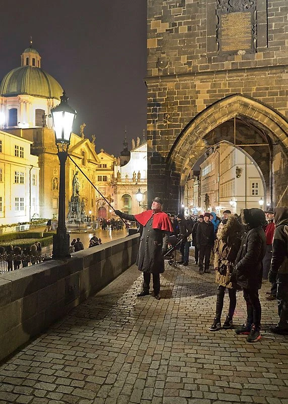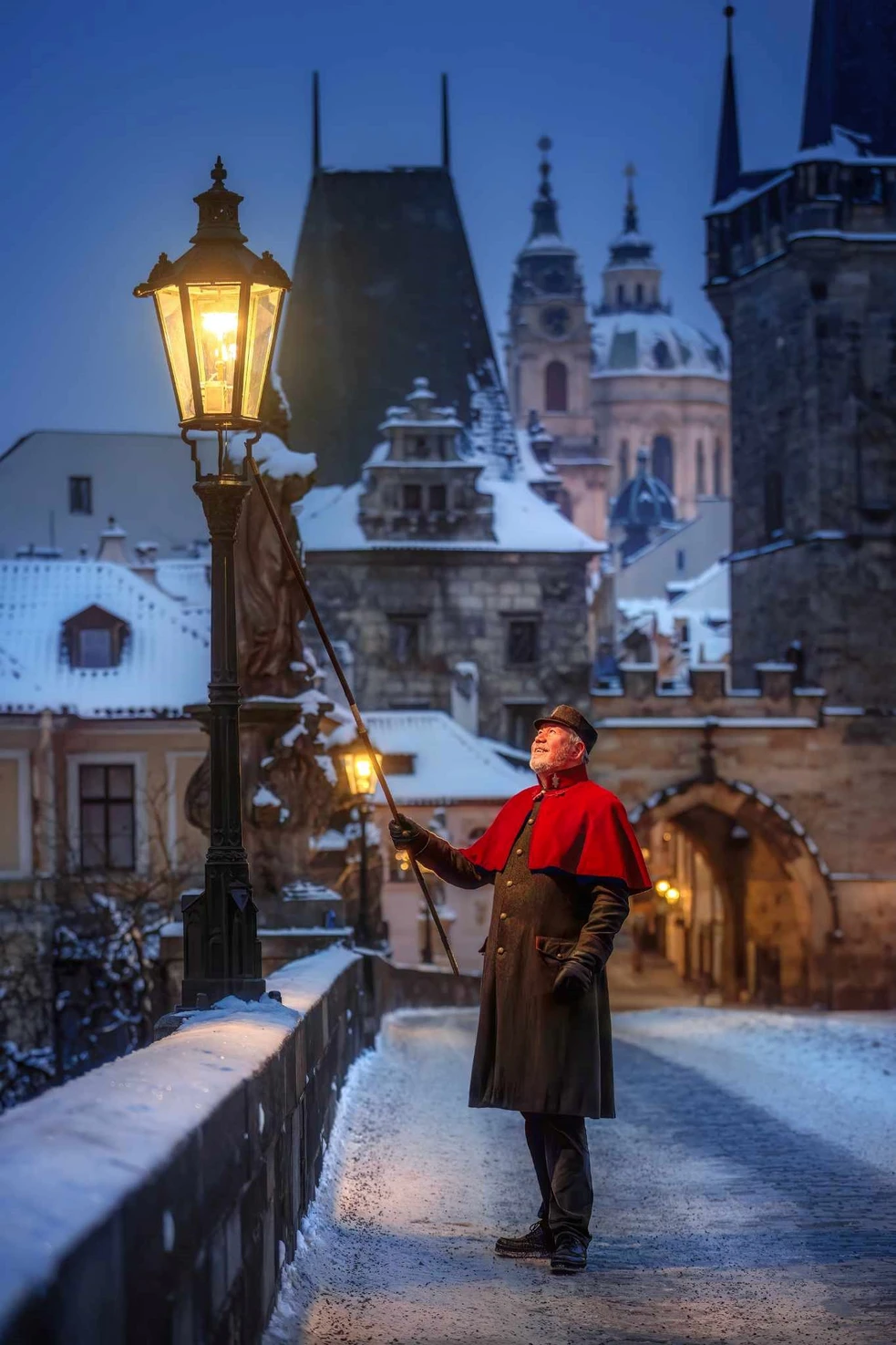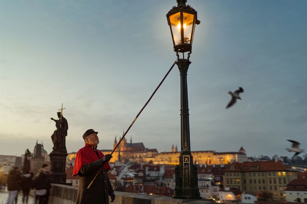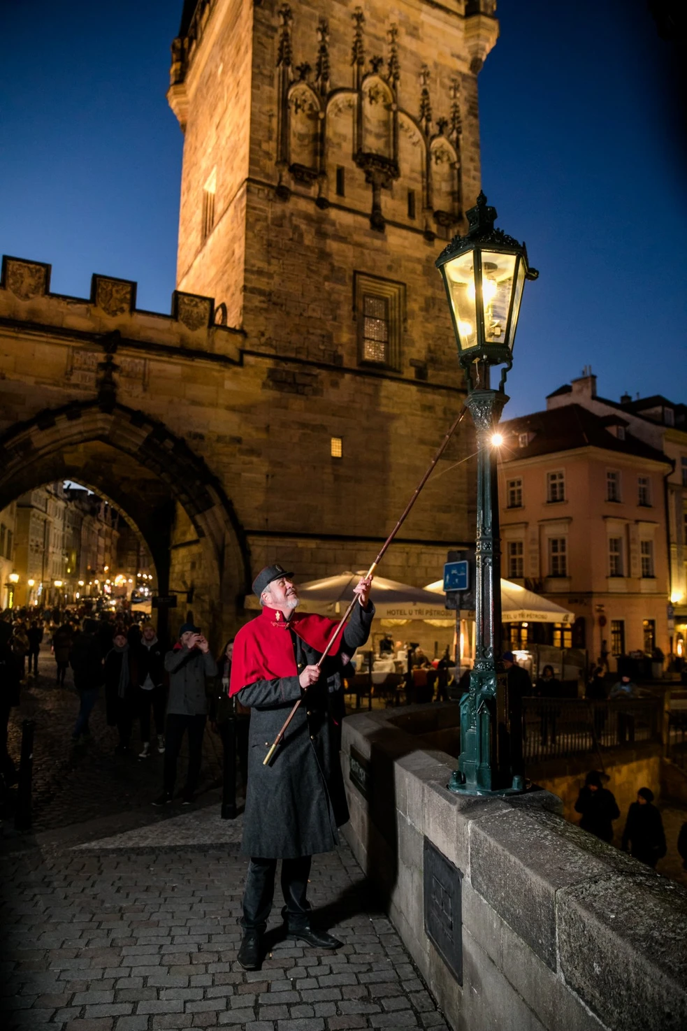 Every year, the Advent atmosphere in Prague's historic center is enhanced by the "old Prague" lamp-lighter. As in previous years, you will have a chance to meet the uniformed lamp-lighter on the Charles Bridge. At approximately 16:00 he will begin to light the historical gaslighting with a burning wick on a long rod near the Old Town Bridge Tower. People can admire the almost forgotten beauty and charm of gas lamps, of which there are a total of 46 on Charles Bridge and Křížovnické Square. Nowadays, the gas lights operate automatically, and Advent is the only time of the year when the gas lamps are lit up by a lamplighter. The lamp-lighter sets off from the Church of St. Francis of Assisi on Křížovnické Square, crosses one side of the bridge to Malá Strana, and then returns on the other side of the bridge. Finally, he lights the remaining gas lamps on Křížovnické Square. Street lighting in Prague dates back to 1847, which is the year when the first gas lamps were lit in this city. By 1940, nearly 9,000 gas lamps cast their bluish glow on the city. Gaslighting was used in Prague till 1985 when the eight branched cast-iron lamps on Hradčanské square and in Loretánská street were converted for electric light. However, 2002 saw the return of gaslight to the city’s most historic areas. In 2010, gas lamps were placed on the Charles Bridge, which is the only gas-lit bridge in the world. Nowadays, you can admire romantic gaslighting on the whole Royal Route, from Powder Gate Tower to Hradčanské square.