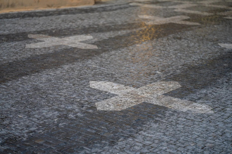 On the pavement next to the St. Nicholas Church in Old Town, you can see the familiar motif of crosses. This particular paving is made with white cut stones.