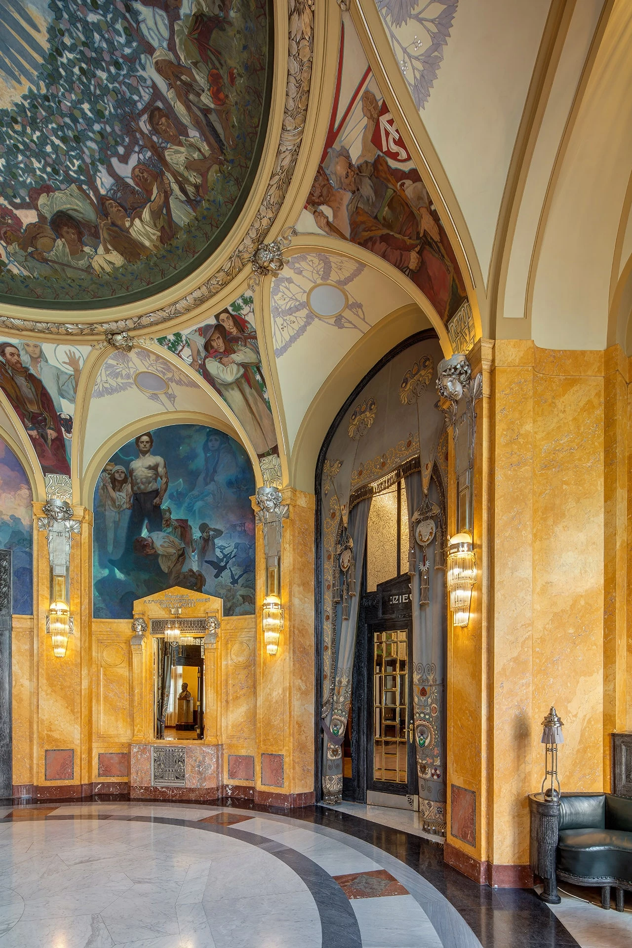 overview about the place Alphonse Mucha expressed his interest in participating in the décor as early as 1902 during the Paris visit of Prague Mayor Vladimír Srb. From the onset he stressed that he would carry out the decoration free of charge, except for covering his costs for the designs, paints, preparatory canvasses and scaffolding. In 1909, Mucha was entrusted with the decoration of the Mayor’s Hall, one of the most prestigious spaces in the building. However, since he won the contract without a tender, he met with a wave of hostility from the Czech cultural public. more about the place The Mayor’s Hall is situated in a circular bay directly above the main entrance. The ceiling is decorated with a fresco on the theme of Slavic Concord. The composition is made up of figural motifs that form a circle with a view opening to the sky, shaded by the wings of a flying eagle. On the walls, in lunettes, are paintings by Alphonse Mucha on aspirational themes: ‘With fortitude toward freedom, with love toward fidelity’ / ‘Humbled and tormented – thou shalt rise again, homeland unbounded’ / ‘Holy mother of thy son’s nation, take kindly to our love and enthusiasm’. The spandrels depict the personifications of virtues through Czech historical figures (Pugnacity – Jan Žižka, Fidelity – Jan Amos Comenius, Independence – George of Poděbrady, Justice – Jan Hus, etc.) Alphonse Mucha authored not only the painting decoration of the hall, but also all the arts and crafts details, including the heating radiator grilles, windows, standing lighting and drapes. The hall thus makes for a stylistically unified work of art, which silenced the critics and doubters of Mucha’s abilities upon completion. The Municipal House stands on a site with a wealth of history. The former King’s Court was once located here, the setting-off point for the coronation processions to Prague Castle. The Municipal House was built between 1905-12 to the design of architects Osvald Polívka and Antonín Balšánek in the Art Nouveau style. The construction and decoration of the Municipal House became a huge artistic enterprise in early 20th century Prague. Leading Czech artists like Max Švabinský, Jan Preisler and Josef Václav Myslbek took part in its decoration.