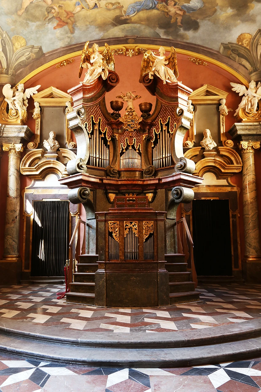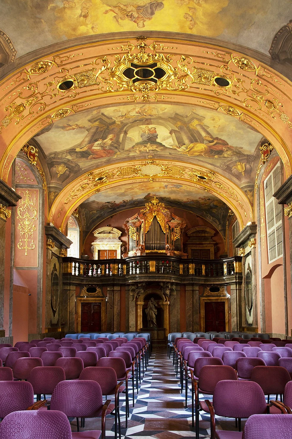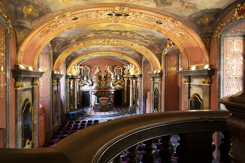 overview opening hours programme about the place The Mirror Chapel, adorned with an intricate interior and an unparalleled arrangement of mirrors, graces the fourth courtyard of the Klementinum on the ground floor of the wing connecting the Astronomical Tower to the northern wing of the college along Platnéřská Street. It serves as a regular venue for classical music concerts, cultural and social gatherings, and even weddings. In the antechamber of the Mirror Chapel stands an over-life-size bust of W. A. Mozart by Emanuel Max. Wolfgang Amadeus Mozart (1756—1791) first visited the Klementinum on 13 January 1787, and returned several more times. During one of his visits, students from the local general seminary reportedly played one of his symphonies for him, and Mozart reciprocated with a performance of his own. opening hours Open only during events. more about opening hours Concerts Royal Czech Orchestra opening hours Open only during events. history The chapel, originally dedicated to the Annunciation of the Virgin Mary, owes its present name to the unusually extensive use of mirrors in the decoration of both the walls and the vault. Its construction was undertaken at the expense of the Latin Major Marian Congregation between 1722 and 1726. The architect’s identity remains uncertain, with attributions pointing towards either František Maxmilián Kaňka or Kilian Ignaz Dientzenhofer. The chapel’s ceiling bears a magnificent five-part fresco painted in 1723 by Jan Hiebel, drawing inspiration from the Ave Maria prayer. Thematically aligned with the life of the Virgin Mary are four oil paintings by Václav Vavřinec Reiner. Among the chapel’s unique furnishings are a pair of Baroque organs, masterpieces of 18th-century craftsmanship. The original organ, dating back to 1732 and crafted by organ builder Tomáš Schwarz, occupies the choir loft. In the 1950s, a Baroque organ originally from the church in Svatobor u Doupova was installed in place of the main altar, which had been lost following the secularisation of 1784. Access to the chapel is provided through a Classicist annexe designed by Matyáš Hummel, whose construction addressed the building’s structural integrity. Thanks to its extraordinary interior, featuring a captivating blend of marble, mirrors, gilded stucco ornamentation, frescoes, and paintings, the Mirror Chapel is one of Klementinum’s most treasured gems.