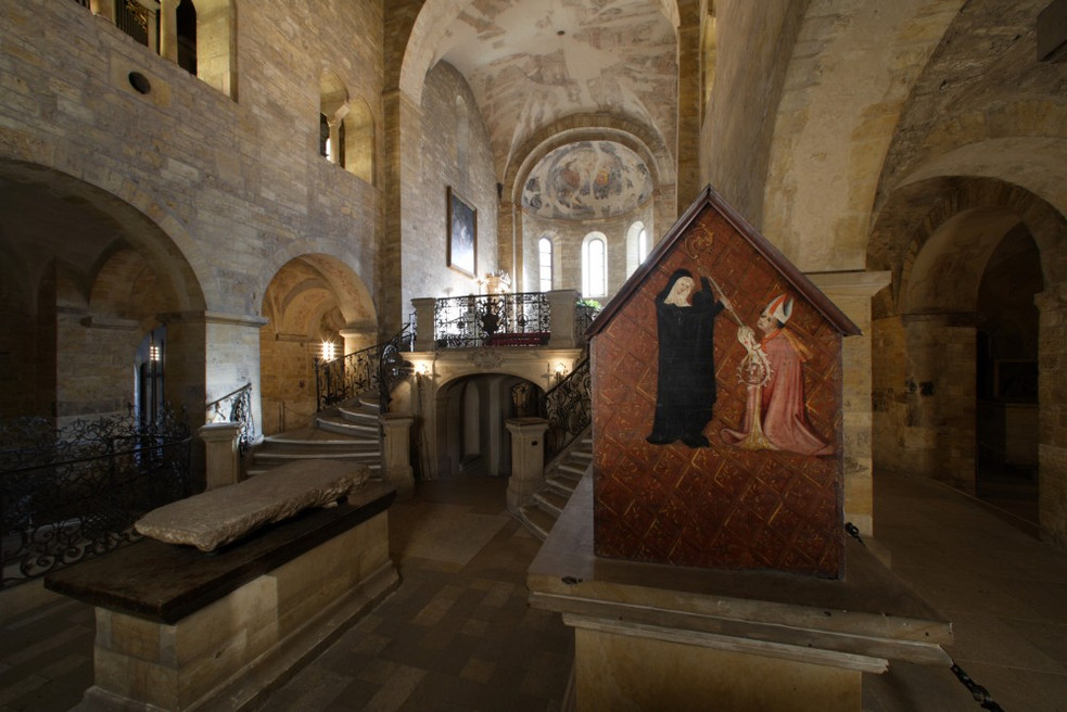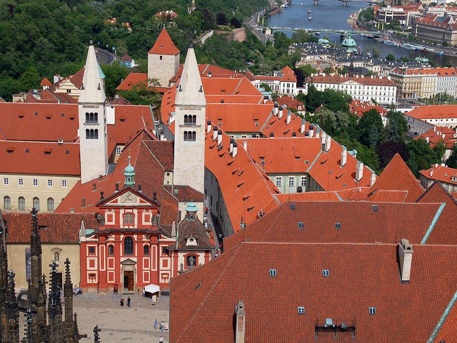 overview opening hours admission about the place One of Prague’s most significant Romanesque monuments, this is the city’s second oldest church and was founded around 920 AD. Standing on Jiřské náměstí, the church is dominated by its two white stone steeples, which reach a height of 41 m. The wider southern tower is called Adam; the narrower northern tower is called Eve and stands at a slight tilt (about 40 cm). The Romanesque interior of the basilica with the tomb of the Přemyslids is included in the Prague Castle guided tour. more about the place opening hours november—march mon—sun 9:00—16:00 april—october mon—sun 9:00—17:00 more about opening hours admission part of the Prague Castle circuit admission (standard CZK 450 | concessions CZK 300 | family CZK 950) more about admission admission part of the Prague Castle circuit admission (standard CZK 450 | concessions CZK 300 | family CZK 950) admission fees in detail opening hours november—march mon—sun 9:00—16:00 april—october mon—sun 9:00—17:00 concerts the basilica is not heated history St. George’s Basilica is located at the Jiřské náměstí and it is one of our most significant Romanesque monuments as the second oldest Prague church established around 920 by prince Vratislav I. In 925, the remains of the murdered princess Ludmila were deposited here, the grandmother of St. Václav and the first Czech martyress. When the neighbouring St. George’s Monastery was established in 973, the temple was extended and re-built into a three-aisle basilica in an Oton’s, early-Romanesque style. After the fire in 1142, the basilica was restored by the mother superior Berta nearly to its present appearance. Two white towers of arenaceous marl with stone roof and two rows of Romanesque windows were added to the side aisles in the East. The thinner, Northern tower was called Eve, and the wider, Southern tower, built above the original separate chapel, was called Adam. Eve is slant, and was reinforced during the 70s in the framework of construction works. In the first half of the 13th century, the Chapel of St. Ludmila with her grave was added. Until 1055, the Basilica served the purpose of the official Premyslid dynasty burial grounds, before the St. Vitus Church was built. Prince Vratislav is buried here, as well as prince Oldřich and Jaromír, probably. In the crypt, accessible via a Baroque staircase, there is a black statue of Brigitte as the symbol of human inconsistency and frailty (depicting a maiden body post mortem). The remains of a Romanesque wall painting are preserved on the choir vault as well as in the neighbouring St. Ludmila’s Chapel. Regarding the original Romanesque furnishings, there are preserved parts of a relief with Madonna crowned by the angels, kneeling mother superior Mlada and Berta, and on the side, there is Přemysl Otakar I and his sister, mother superior Agnes (Anežka). The view of the end of the ancient basilica from the Jiřská Street is the most impressive. The church portal in the Jiřská Street was made by the Benedikt Ried smelting plant around 1520, decorated by a view of a knight fighting a dragon in the frontispiece. In the 14th century, a new front face was built in the West, modified in the 17th century in an early Baroque style with a typical terracotta facade. The front face is decorated by a sandstone statue of the founder of Vratislav I Church and the foundress of Blessed Mlada Monastery; the author probably being Jan Jiří Bendl. In the years 1718—22, František Maxmilián Kaňka added a baroque Chapel of St. John of Nepomuk in the South-Western corner, which was built to celebrate his beatification. On the front face, there is his statue with angels by Ferdinand Maxmilián Brokoff; the interior was painted by Václav Vavřinec Reiner. The South wall of the main aisle houses a series of paintings with the theme of St. Voršila’s martyrdom and 11 000 of Christian virgins by H. Burgkmair from the 16th century. There is a monument from the years 1947/48 named „Christ from the Trunk of a Tree“ by Otto Herbert Hájek in the Northern side aisle; the author donated the monument to the Czech people and to president Havel as a manifestation of reconciliation. During the era of Joseph II, the abolished St. George’s Monastery was used by the army, and the church dilapidated considerably, too. In the years 1887— 1908 it was reconstructed according to the design of František Mach, who tried to renew the original Romanesque appearance. Archaeological research took place in the church and in the monastery in the years 1958—64. Prague Castle has been a National Cultural Monument since 1962.