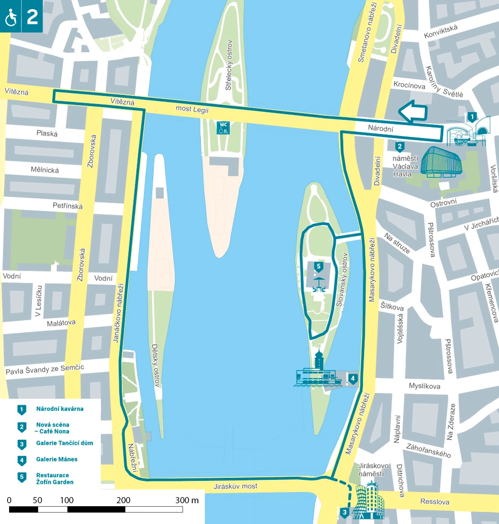 overview about the place The Vltava River, while running through Prague, is adorned with thirteen islands of various size. Some of them come to life during the summer with cultural festivals, others are quiet all year round. Let‘s get out to see at least three of them. They are all within sight of the National Theatre, where — at the adjacent partially accessible tram stop — our walk begins and ends. The terrain is mostly flat, with only slight inclines and declines at certain places. The occasional narrow passages have a minimum width of 90 cm. In terms of accessibility, the greatest complication on the route is presented by the historic cobblestone pavement on some of the crosswalks and steep incline of the lowered curbs. Access to Children‘s Island (Dětský ostrov) is challenging, with a steep footbridge connecting it to the access sidewalk on the bank. We recommend personal assistance to overcome these obstacles. more about the place Source: Prague City Tourism route description Difficulty Rating: Easy to Moderate Route Length: 3,2 km | → National Avenue → Legion Bridge → Střelecký Island National Avenue (Národní třída), separating the Old and the New Town, dates back to the second half of the 18th century, when the future high street started of a filled-in moat. A few decades later the waterfront started to get new features with the Chain Bridge of Emperor Franz Joseph I (now called Most Legií, Legions‘ Bridge). The street was uplifted considerably with the building of Neo-Renaissance National Theatre (Národní divadlo) in 1881, around which an elegant neighbourhood soon sprang up with the art gallery in the Topič Salon, the Slavia café and the Academy of Sciences building.The building of the National Theatre was financed through a nationwide collection and opened in 1881. Then, after a devastating fire, it reopened again in 1883. The theatre‘s façade and interior are decorated with outstanding works of notable Czech artists — Aleš, Ženíšek, Hynais, Myslbek, et al. A plaque placed on the front of the Kaňka Building (Kaňkův dům, also known as Schirding Palace, which is found near the intersection with Mikulandská Street) commemorates a key event from Národní třída‘s modern history: It was right here that the violent crackdown on a peaceful student demonstration on 17 November 1989 set into motion the events that later became known as the Velvet Revolution. We can stop to spend a while pondering the avenue‘s eventful history over a coffee at Národní kavárna (The National Café) which has, unlike the more famous Slavia Café, a barrier-free entrance. The enterprise was founded in 1896, but its heyday came between the wars, when the Czech intelectual community used to meet regularly here, sipping coffee by the low café tables and discussing hot topics of the day. After saying good-bye to Národní třída, we continue to the Legions‘ Bridge via a crosswalk on the right. The crossing has lowered curbs on both sides, but the lane surface is partially paved with cobblestones and there are tram tracks to be crossed. The connecting sidewalk on the right side of the bridge is paved with mosaic stones, occasionally slightly damaged. The Legions‘ Bridge (Most Legií) was formally opened in 1901 and the event was attended by Emperor Franz Joseph I, after whom the new bridge took its name. However, after Czechoslovakia gained its independence in 1918, it was renamed the Legions‘ Bridge. The bridge is 343 metres long and 16 metres wide. The two built-in towers originally served for toll collecting. The bridge and Střelecký Island (Střelecký ostrov) beneath it are connected by a publicly accessible lift (110 x 130 cm, open 24/7) with a short metal footbridge leading to it. Stretching out from the lower lift station there is a park with well-maintained dirt paths. At the northern tip of the island, sitting under the tall chestnut trees, we can enjoy the view of the Kampa neighbourhood and Prague Castle on the left bank of the river and the National Theatre building back on the right. We run into more diffi cult cobbled surface under the arch of the bridge, which leads to the south half of the island. This is also where public toilets are located. The south part of the island is open to the public only up to the historical building of the former shooting range. → Janáček Embankment → Jirásek Bridge Take the lift back up onto the bridge and cross it, still on the righthand side, to the other bank of the river. There is a more difficult part with steeper curbs and rougher paving at the end of the bridge and while crossing the streets Všehrdova and Šeříkova. We take the first crosswalk to the other side of Vítězná Street and return along the paved sidewalk back to the bridge and turn onto the Janáček Embankment (Janáčkovo nábřeží). Along the left side of the street lined with trees we head south towards Jirásek Bridge (Jiráskův most). On the way, we can admire the elegant tenement houses built at the end of the 19th century and nowadays making a part of the Prague Heritage Reserve Area. Opening from the intersection of the Janáček Embankment and Pavla Švandy ze Semčic Street there is a small park. From there a footbridge leads to Children‘s Island (Dětský ostrov), a popular relaxation area complete with a large children‘s playground and enjoying a wonderful view of the opposite bank of the river. However, the incline of the access bridge and connecting ramp is quite steep, in places as much as 17%. The broad central path that runs across the island has a hard, fl at surface made of interlocking concrete paving stones. Whether we stop at the island or not, our route continues towards a water reservoir built in 1562 to supply the fountains of Lesser Town with water. It was erected on the smallest Prague island (called Petržilkovský Island) and it is not open to public. The crosswalk with lowered curbs next 