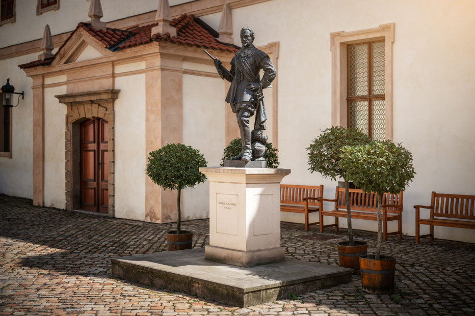 One of the courtyards of the Waldstein Palace is embellished with a statue of its builder – the duke of Frýdlant, warlord and one of the most important figures in the Thirty Years’ War — Albrecht Waldstein. The statute was designed by Ludvík Šimek, who created a thirty-centimetre model some time before the year 1870. The author of the 300 kg bronze cast, which is almost 2 metres high with the pedestal, is Petr Dvořák. Source: Prague City Tourism