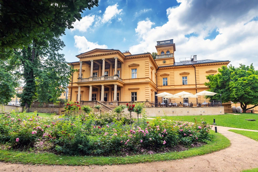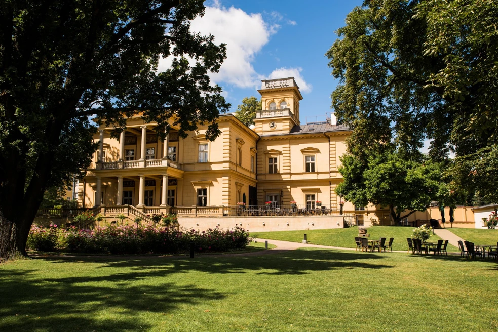 This neo-Renaissance villa, designed by Vojtěch Ignác Ullmann, was built in 1872 as a summer retreat by entrepreneur, art collector and patron Vojtěch Lanna Jr. The exterior of this listed building is adorned with frescoes based on paperboards by Josef Mánes and executed by Viktor Barvitius, who also worked on the interior frescoes. On the ground floor, there are four grand salons themed on Greek and Roman mythology, complemented by allegorical and realistic paintings celebrating the builder's work and social activities. The representative premises of the Czech Academy of Sciences are now used for accommodation, conferences and cultural events. A café with a seasonal and daily menu is open to the public.