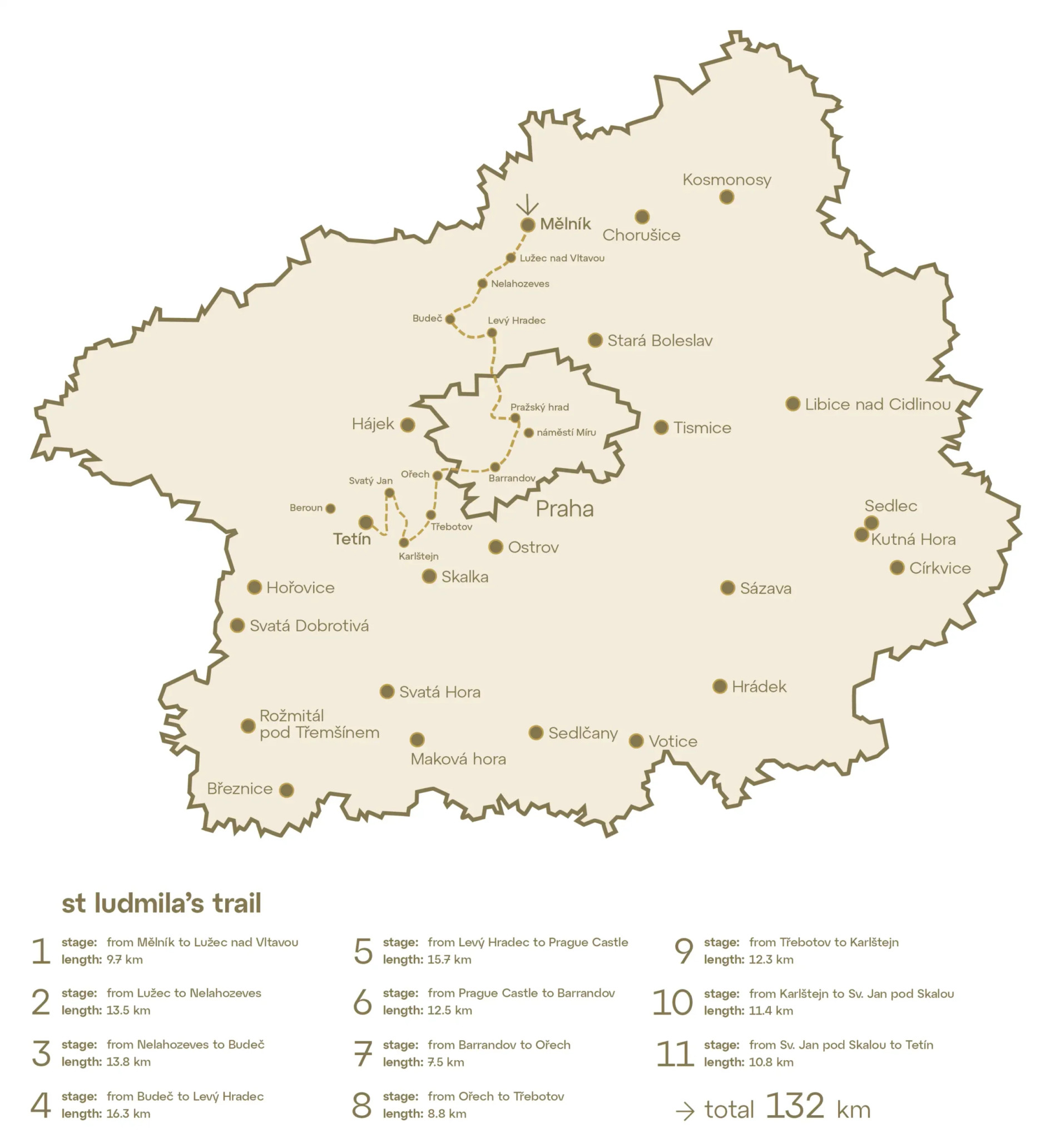 Il nuovo percorso di pellegrinaggio e turistico misura 132 chilometri e collega, in 11 tappe, alcuni tra i più antichi insediamenti documentati della Boemia. In alcuni luoghi troverai le rovine di antichi insediamenti fortificati, altrove rotonde o chiese conservate; in altri ancora soltanto ampi spazi disboscati su uno sperone roccioso, dove un tempo sorgevano delle fortificazioni. Se ti lasci avvolgere dall’atmosfera degli insediamenti medievali, basta chiudere gli occhi e immaginare la scena: dalle vigne di Mělník galoppa una cavalcata con la fanciulla pagana Ludmilla, che sta per sposare il duca Bořivoj I della dinastia dei Přemyslidi. È proprio a Mělník, dove dal belvedere potrai ammirare la confluenza della Moldava e dell’Elba, che inizia il Cammino di Santa Ludmilla. Link all’itinerario sul sito mapy.cz. Sentiero di Santa Ludmila | Fonte: Prague City Tourism Cammino di Santa Ludmilla, Mělník Verso gli edifici degli albori della nostra storia Da Mělník i tuoi passi ti porteranno verso sud, passando per Nelahozeves e Kralupy nad Vltavou, fino ai resti dell’antico insediamento fortificato dei Přemyslidi di Budeč, presso il villaggio di Zákolany. La chiesa locale di San Pietro e Paolo risale a undici secoli fa e, nel suo nucleo originario, è l’edificio esistente più antico della Repubblica Ceca. Proprio a Budeč il nipote di Ludmilla e patrono delle terre ceche, Venceslao, imparò la liturgia cristiana e il latino. E forse qui, oppure qualche chilometro più a est, a Levý Hradec, il duca Bořivoj I e Ludmilla decisero di abbracciare il cristianesimo, rinunciando così agli dèi pagani ed entrando a far parte in un’alleanza d’avanguardia degli stati europei. Con questa scelta determinarono per secoli la direzione che lo stato ceco avrebbe intrapreso. Nel paesaggio delle cave dalla storia cupa Dopo aver visitato i due antichi insediamenti, il cammino ti condurrà fino al Castello di Praga. Qui, nella basilica di San Giorgio, il duca Venceslao fece trasportare nel 925 da Tetín la salma della nonna Ludmilla; qui si trovano ancora oggi le sue reliquie. Da qui proseguirai attraverso il quartiere praghese di Barrandov e i villaggi di Ořech e Třebotov fino al Carso boemo. Attraverso il paesaggio delle cave, dove negli anni ’50 del XX secolo lavorarono in condizioni durissime i prigionieri politici, raggiungerai Karlštejn. Questo territorio affascinante, geologicamente interessante, ti accompagnerà fino al mistico villaggio di Svatý Jan pod Skalou, con i suoi splendidi panorami, le tracce delle attività minerarie e i ricordi della vita del pellegrino San Giovanni l’Eremita, che secondo la leggenda Bořivoj e Ludmilla conobbero anche personalmente. Tetín | Fonte: Berounsko, z.s. e TO Brdy Podbrdsko Tetín, testimone muto dell’omicidio della duchessa Ludmilla Davanti a te apparirà poi Tetín, residenza vedovile della duchessa Ludmilla, che vi si ritirò dopo il conflitto di potere con la nuora Drahomíra. Proprio qui, nel 921, la raggiunsero gli assassini che, su ordine di Drahomíra, la strangolarono. Dopo la visita ai monumenti, Tetín ti regalerà una vista mozzafiato sul fiume Berounka e sulla città di Beroun. Ciascuna delle undici tappe del Cammino di Santa Ludmilla offrirà ai pellegrini diverse domande su cui riflettere, legate alla figura di Santa Ludmilla o al luogo in questione. A Praga è possibile deviare dal percorso principale e compiere un percorso autonomo. Questa tappa intermedia ti condurrà, per esempio, a Vyšehrad o alla basilica di Santa Ludmilla a Vinohrady. Chiesa di Santa Ludmilla | Fonte: Prague City Tourism Sulle tracce dei primi duchi e re cechi La tappa praghese del Cammino di Santa Ludmilla racconta la nascita del primo stato ceco, la storia dei primi sovrani, dei santi nazionali e dei patroni. E soprattutto della prima santa boema, la duchessa dei Přemyslidi Ludmilla: una donna forte e ispiratrice, anche figura politica, che insieme al marito Bořivoj I nel X secolo rinunciò agli dèi pagani e abbracciò il cristianesimo. Con questo passo determinò una nuova direzione per lo stato dell’alto Medioevo. Church of St Ludmila Vinohrady view Church of St Havel Staré Město view Chapel of St Ludmila Vyšehrad view Church of St Thomas Malá Strana view Prague Castle Hradčany view Prague Castle — St George’s Basilica Hradčany view load the map Statua di Santa Ludmilla sul Ponte Carlo | Fonte: www.wikipedia.com Il culto di Ludmilla come santa iniziò a diffondersi dal monastero delle benedettine, adiacente alla basilica di San Giorgio al Castello di Praga. Proprio qui il nipote di Ludmilla, il duca Venceslao, fece trasportare il suo corpo da Tetín, dove la duchessa era morta nel 921. La tomba di Ludmilla si trova nella basilica ancora oggi. I luoghi e gli edifici che rimandano a Ludmilla, a suo nipote e patrono San Venceslao e ad altre figure degli albori della storia ceca sono innumerevoli a Praga. La tappa praghese del Cammino di Santa Ludmilla attraversa alcuni di essi. Sulla riva sinistra della Moldava si trova la chiesa neorinascimentale di San Venceslao a Smíchov. Sulla riva destra, per esempio, il monastero di Emmaus, un tempo centro della liturgia slava, fondato da Carlo IV. Il complesso fu gravemente danneggiato durante i bombardamenti del 1945. Il percorso conduce anche a piazza Náměstí Míru, dove sorge la chiesa neogotica di Santa Ludmilla. La sua costruzione fu completata nel 1892, in un periodo in cui il quartiere di Vinohrady stava vivendo un rapido sviluppo e aveva urgente bisogno di una nuova chiesa parrocchiale. La tappa successiva è uno dei simboli fondamentali di Praga: il complesso di Vyšehrad. Nel Medioevo servì come uno degli insediamenti fortificati dei Přemyslidi. Nello spazio antistante la basilica di San Pietro e Paolo si trova una piccola cappella a nicchia dedicata a Santa Ludmilla. Anche i bastioni delle fortificazioni di Vyšehrad portano il nome dei santi: quello di Ludmilla 