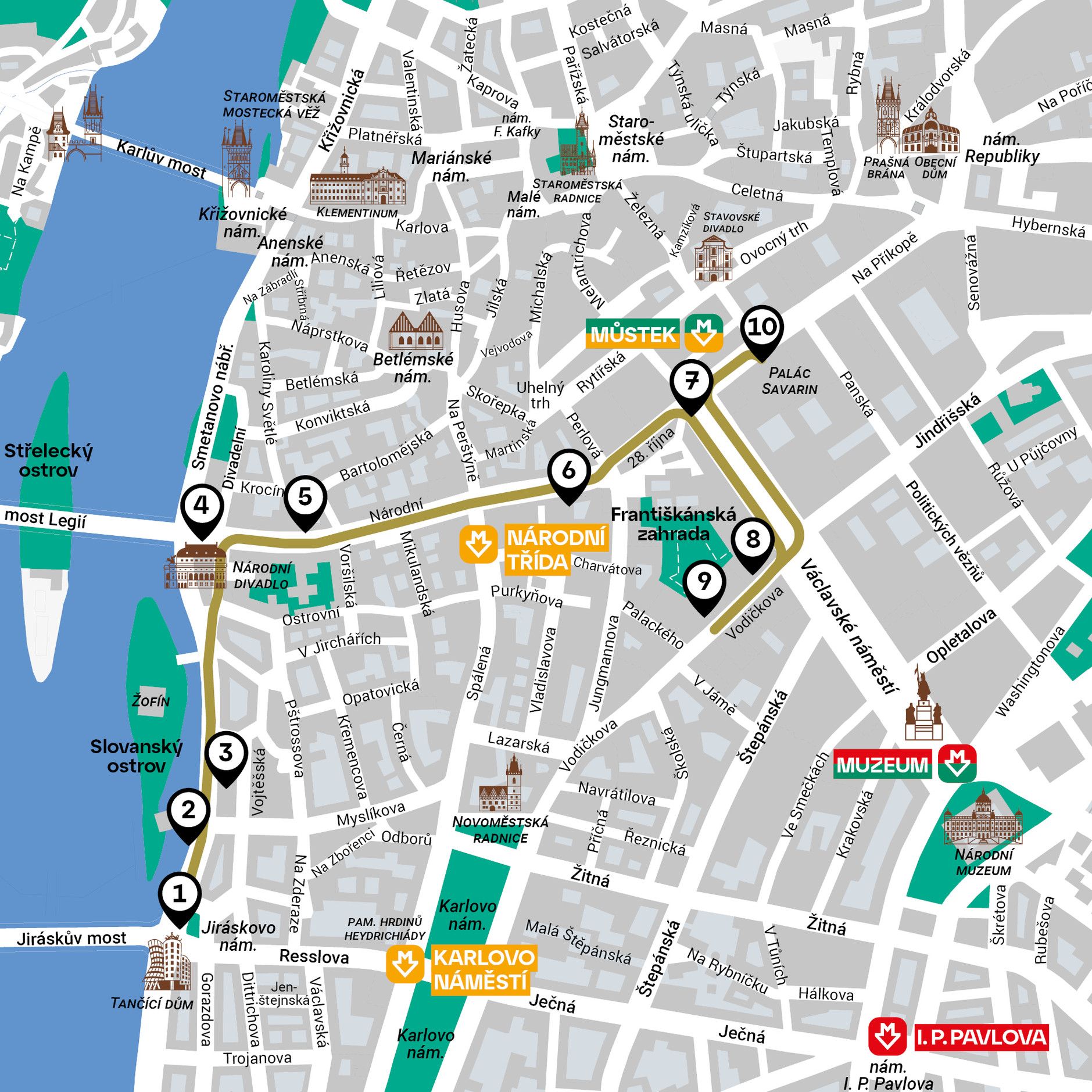 Walking route: Masaryk embankment — Hlahol Association House — National Theatre — Topič Salon — Národní třída — Wenceslas Square — Vodičkova street — Museum of Alphonse Mucha in the Savarin Palace On this route you will follow the footsteps of Alphonse Mucha in the New Town of Prague. From Jiráskovo square you will walk along the Vltava river to the Hlahol Association House, where a sizeable Mucha canvas still hangs. From there, the route continues along places connected with Mucha’s personal and professional life to the National Theatre, where he first met his future wife, to the Topič Salon, where the first Prague exhibition of his works took place, then to the studio where he made the designs for the famous Slav Epic. The walk ends at the new Museum of Alphonse Mucha in the Savarin Palace. Masaryk Embankment — Hlahol Association House From the Jiráskovo náměstí stop you can take a walk along the Vltava river. The Masaryk Embankment is itself a showcase of Historicist and Art Nouveau buildings from the turn of the 19th and 20th centuries, built here as part of the project to contain the Vltava riverbanks and redevelop the old waterfront buildings. One of the true gems of Prague’s Art Nouveau architecture is the Hlahol Association House (Masarykovo nábřeží 16), where the choral association of that name (“hlahol” means the sound of resounding, ringing-out) is still based today. The Hlahol Association was founded in Prague in 1861, first as a male voice choir, but from 1879 grew to include a female choir. The building was built to the design of arch. Josef Fanta in 1903—1905. In addition to the much-prized architecture, it is also worth seeing the interior of the building, with many original Art Nouveau features, fittings, chandeliers and doors still preserved. One of the gems is Mucha’s large lunette canvas on the theme of Song — an allegory of singing, which the painter began in 1921 and worked on for 13 years. Today, the canvas is situated in the great hall on the ground floor of the building. In a landscape steeped in rosy light are depicted several figures: ‘A National Song as attended by chirping birds, a Lullaby of Maternal Love, personified Love for the Homeland, personified Prague and her being lauded by numerous heralds.’ (Citation provided by the Mucha Foundation) Source: www.hlahol.cz You will carry on along the Masaryk Embankment, where just a few blocks away is another pearl of Prague Art Nouveau architecture, the Goethe Institute, built in 1905 to the design of arch. Jiří Stibral. The National Theatre You are just a few steps away from the National Theatre, a showy neo-Renaissance building on the corner of Masaryk Embankment and Národní třída boulevard. Its construction became a symbol of the cultural revival of the Czech nation and its décor a showcase of romanticizing paintings and sculptures in Bohemia. Construction began in 1868, the theatre was inaugurated for the first time in 1881 (and after it caught fire, once again in 1883). A number of the leading artists of that time participated in the decoration, and were to become known as the National Theatre generation: the sculptors Josef Václav Myslbek and Bohuslav Schnirch as well as the painters Mikoláš Aleš, František Ženíšek, Václav Brožík or Julius Mařák. During the Auguste Rodin exhibition in Prague in 1902, the accompanying cultural events programme for the French delegation also included a visit to this symbol of national revival. Alphonse Mucha was present with Rodin that evening, and this was to be a turning-point in his life. It was here that he was first seen by his future wife Marie Chytilová, a student of applied art with whom he became close a year later after he took her on as his pupil in his Parisian studio. Three years after that, in 1906, they married. Topič Salon — Národní třída On the opposite side of Národní třída nearby are two buildings rebuilt in the Art Nouveau style to the architectural project of Osvald Polívka — the first one, inscribed Pojišťovna Praha was built in 1906—1907, the neighbouring house with the inscription F. Topič in 1905—1906. At the turn of the 19th and 20th centuries, increasingly renowned exhibitions of modern art were held under the ‘Topič Salon’ moniker at the present-day Art Nouveau building of Pojišťovna Praha, The publisher and leading light of book culture, František Topič, had an exhibition hall built for these purposes in the courtyard of the building. In 1897 it housed a travelling exhibition by Alphonse Mucha, en route from Paris to many world capitals. It was Mucha’s first solo exhibition in Prague and the first exhibition of Art Nouveau in Prague. Showing at that time, among other things, were the posters he created for Sarah Bernhardt, the very works that made Mucha famous (Gismonda, Lorenzaccio and others). In addition to his posters, Mucha’s book illustrations were also shown. In 1905, the Topič publishing house and art salons moved to the premises of the adjacent Art Nouveau building. Topič Salon | Source: Prague City Tourism Let us proceed along Národní třída to No. 28. Just where the current neoclassicist building now stands used to be a Baroque house from the first half of the 18th century, called U Choděrů — after a local and much acclaimed restaurant. In this house, specifically in the Rubeš Salon, an exhibition of Mucha’s drawings was held from 4 June to 4 July 1915. The building was demolished in 1920 to meet building regulations. Wenceslas Square — Vodičkova street Going on, the route of our walk leads straight along ‘28th October street’ to Můstek and from there we’ll take a right, up Wenceslas Square. Roughly in the middle of the square, at Vodičkova street, stands the Ligna Palace building, which originally housed the Czech Bank. The palace in the style of late Art Nouveau Neoclassicism was built in 1914—16 to the desi