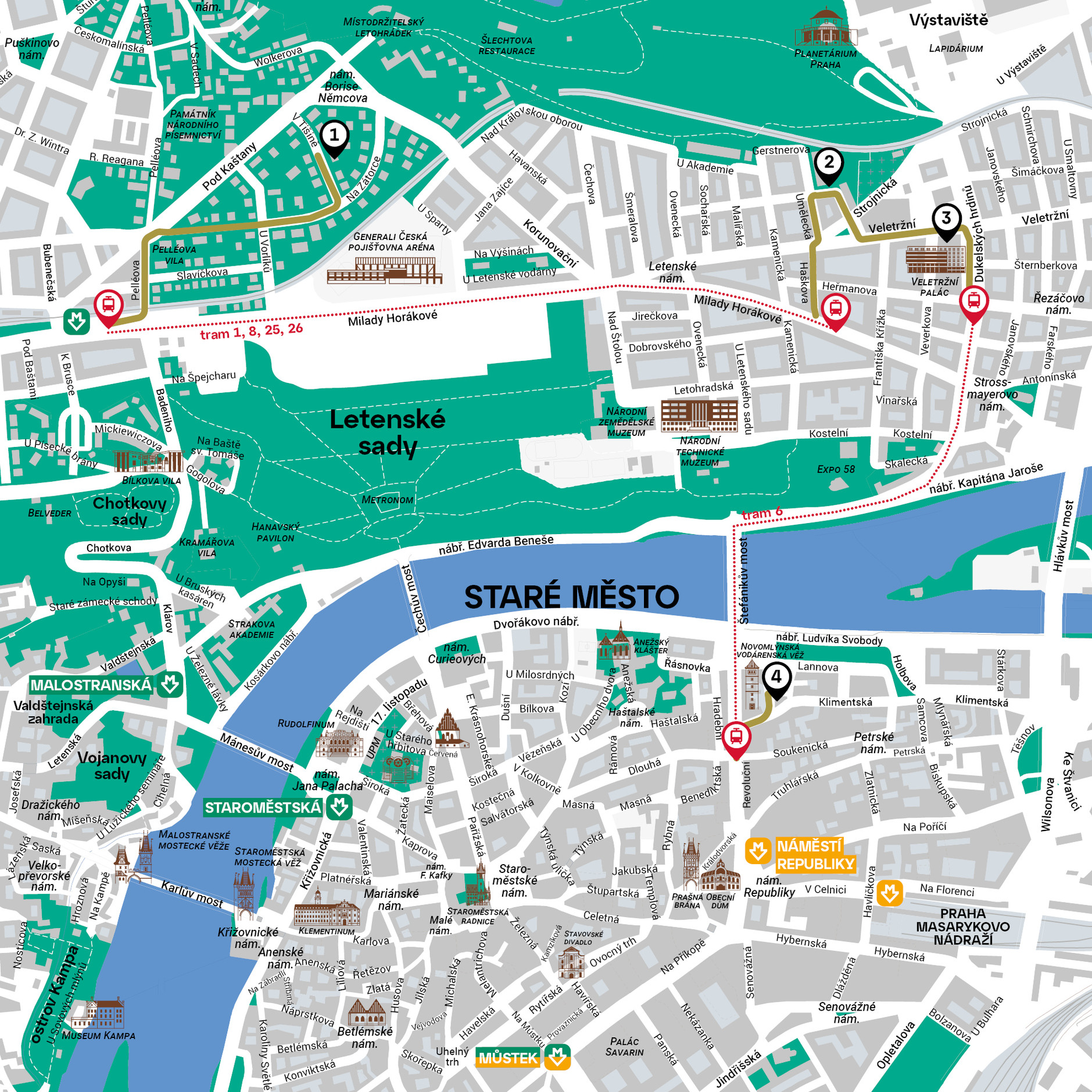 This route is partly on foot and partly by tram: Mucha’s villa — U Studánky school — Trade Fair Palace — Postal Museum Mucha’s villa Your walk begins in Bubeneč at Mucha’s villa, which is located at V Tišině 4. The architectural design of the villa in the Neoclassicist style was commissioned by Alphonse Mucha from the architect Bohumil Hybšman, and its realization took place between 1925 and 1928. This has two upper floors, where the ground floor and first floor served as living space, with Mucha’s studio on the second floor. Shortly after the Nazi occupation and the death of Alphonse Mucha, a Wehrmacht officer moved into the villa, who greatly contributed to the fact that Alphonse Mucha’s widow Marie Muchová was allowed to stay in the house, as well as preserving the collection of Mucha’s works. After the end of the war, Mucha’s son Jiří and his family moved here. In 1950 however, the villa was nationalized and its residents forcibly evicted. After 1990, it was returned to the family, rented to the Embassy of Ghana and sold to financier Pavel Hubáček by Jarmila Mucha Plockova in 2015. The villa has been completely renovated. U Studánky elementary school and kindergarten After a short tram ride from Hradčanská to the Kamenická stop, you will get to see a number of buildings that are inherently connected with the life and work of Alphonse Mucha. Today’s U Studánky elementary school and kindergarten of the Charles University Faculty of Education at Umělecká 8 was built on the site of a former well that used to supply the nearby ‘Meierhof’ manor of the ecclesiastical administrator; hence the poetic name, which means ‘by the wellspring’. Construction took place between 1901 and 1902 in the neo-Renaissance style to the design of city engineer J. Zlatník. The elementary and secondary schools were divided into a girls’ (northern) and boys’ (southern) sections. Source: https://fzsumelecka.cz The interior of the former school chapel served to store the Slav Epic canvasses from 1926 on. ‘For the provisional storage of the ‘Epic of all the Slavs’ paintings by Master Mucha, the former exhortation hall on the second floor of the “U Studánky” school in Prague VII has been designated’, (source: Mucha Foundation, cit. City Council, 15th meeting, 16 April 1926, IN: Bulletin of the City of Prague. 19 April 1926). ‘… now I have a studio here, as negotiated from the municipality, which I’m presently arranging. There I will work on finishing and completing each tableau in turn. It behoves for all 20 canvasses to fit in there and be so placed that I could reach each one. This will be devised by hanging them on girders, with pulleys and shunting.’ (source: Mucha Foundation, cit. Alphonse Mucha, Prague letter to his brother-in-law Jan Remund, Rosice, 13 May 1926). It was at the U Studánky school that Mucha also completed this magnificent work in 1928. The Trade Fair Palace Moving on from the school, this time we’ll walk along Umělecká street to Veletržní and then go on to the impressive building of The Trade Fair Palace. It was in its time the largest building of its kind in the world, and Prague’s first building in a new style — Functionalism. During the First Republic, this palazzo was used primarily to serve the needs of trade-fair exhibitions. For Alphonse Mucha, however, the Trade Fair Palace acquired a different and profound meaning: the completed cycle of the Slav Epic i.e. all 20 canvasses, was presented to the Prague public for the first time there, in the Great Hall; this happened in the autumn of 1928 on the occasion of the celebration of ten years of independence of the Czechoslovak republic. The Slav Epic exhibit was treated with great regard, the Great Hall was transformed into an autumn orchard, where paths sprinkled with sand led around the paintings. The Slav Epic cycle No.18: The Oath of Omladina under the Slavic Linden Tree (1926) | Source: www.muchafoundation.org During the Nazi occupation, the Trade Fair Palace became sadly infamous as the massing-point for Jews sent to the concentration camps, later serving as an administrative building and suffering a major fire in 1974. Since 1995 it has been the Prague seat of the National Gallery, whose collections include Mucha’s portrait of Josephina Crane Bradley as Slavia, his oil painting ‘The Czech Heart’ and a number of Mucha’s poster designs. The Postal Museum To get there you can take Tram No. 6 to the stop at Dlouhá třída — our destination is the Postal Museum. Alphonse Mucha became widely known not only for Sarah Bernhardt posters or the Slav Epic, but also as the author of the first Czechoslovak postage stamps. These can be seen in the Postal Museum, which was established shortly after the founding of Czechoslovakia, on 18 December 1918. Postal history memorabilia were meant to illustrate the special standing of the Czech and Slovak nation. At the same time, on the same day, the first Czechoslovak stamp was issued, to a design by Alphonse Mucha representing the Hradčany castle skyline. The newly established postal administration asked for a design on October 30, saying that in order to mass-reproduce the monetary‑value stamp, which was of utmost importance to the state, the design had to be ready within 24 hours. ‘One day, after visiting Prague, he did not go to his large workshop, but sat down at the window in the library where he sketched some compositions, and on one of them I saw the outline of Hradčany in the background. When I asked what he was doing, he told me: ‘These are the new stamps for the Matice organisation and I have to hurry with them, they will be printed at the Union printworks right away.’ I noticed that he was joyful and excited, but I didn’t inquire further. I was not surprised, because he was so often engaged in drawing stickers and posters for our national associations. It was only when the first print proofs 