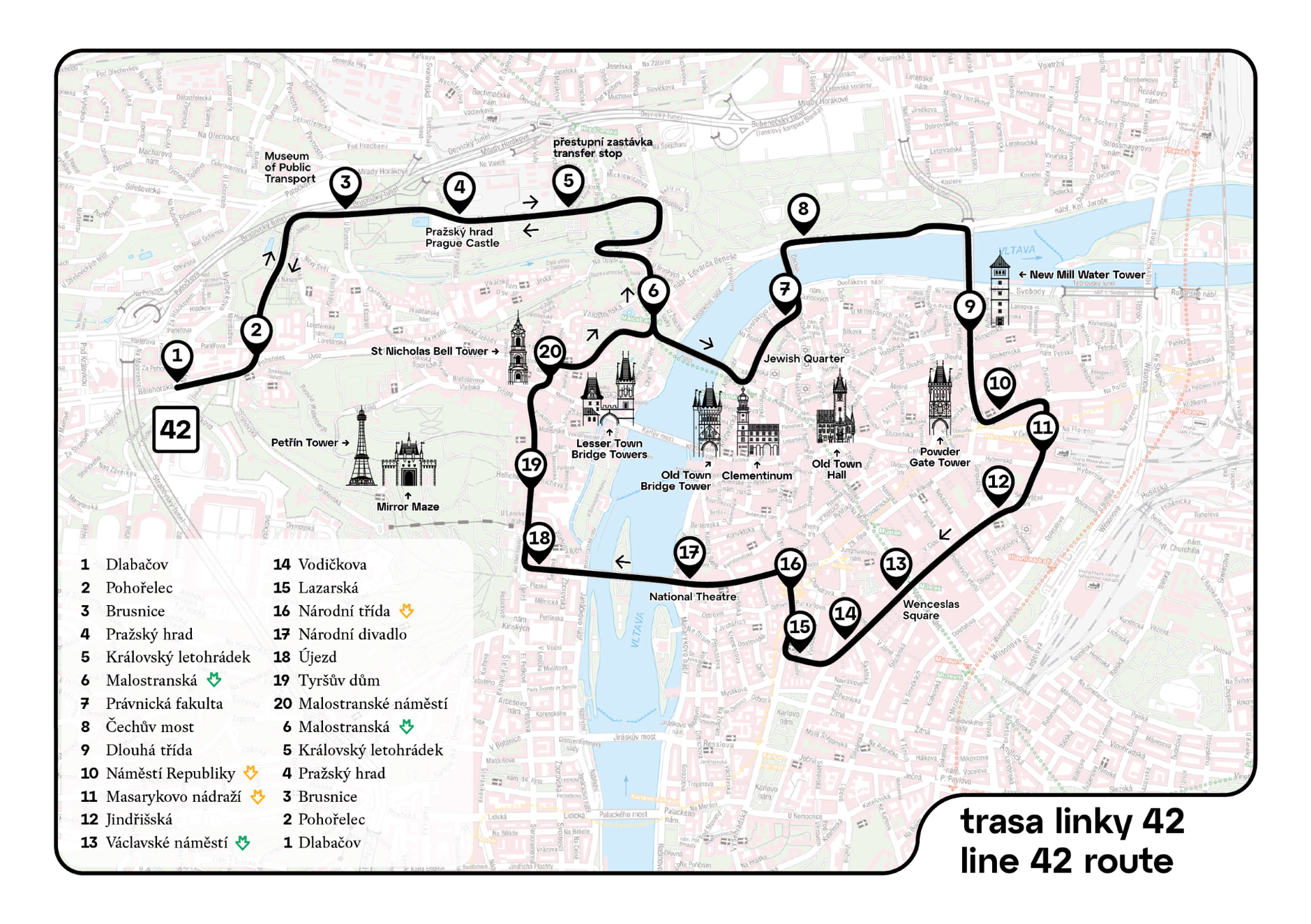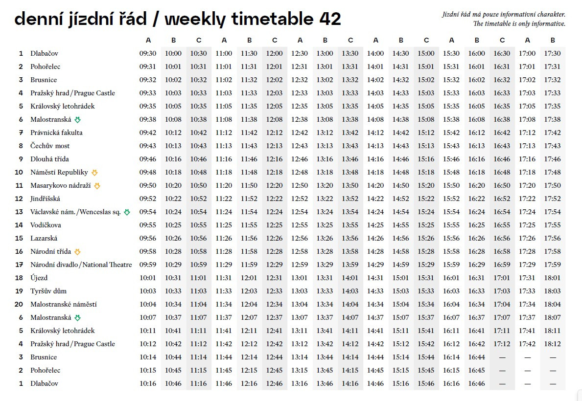 daily 10:00—18:00 every 40 minutes departures from Dlabačov 10:00 | 10:40 | 11:20 | 12:00 | 12:40 | 13:20 | 14:00 | 14:40 | 15:20 | 16:00 | 16:40 | 17:20 route Dlabačov → Pohořelec → Brusnice → Pražský hrad → Královský letohrádek → Malostranská → Právnická fakulta → Čechův most → Dlouhá třída → Náměstí Republiky → Masarykovo nádraží → Jindřišská → Václavské náměstí → Vodičkova → Lazarská → Národní třída → Národní divadlo → Újezd → Tyršův dům → Malostranské náměstí → Malostranská → Královský letohrádek → Pražský hrad → Brusnice → Pohořelec → Dlabačov.